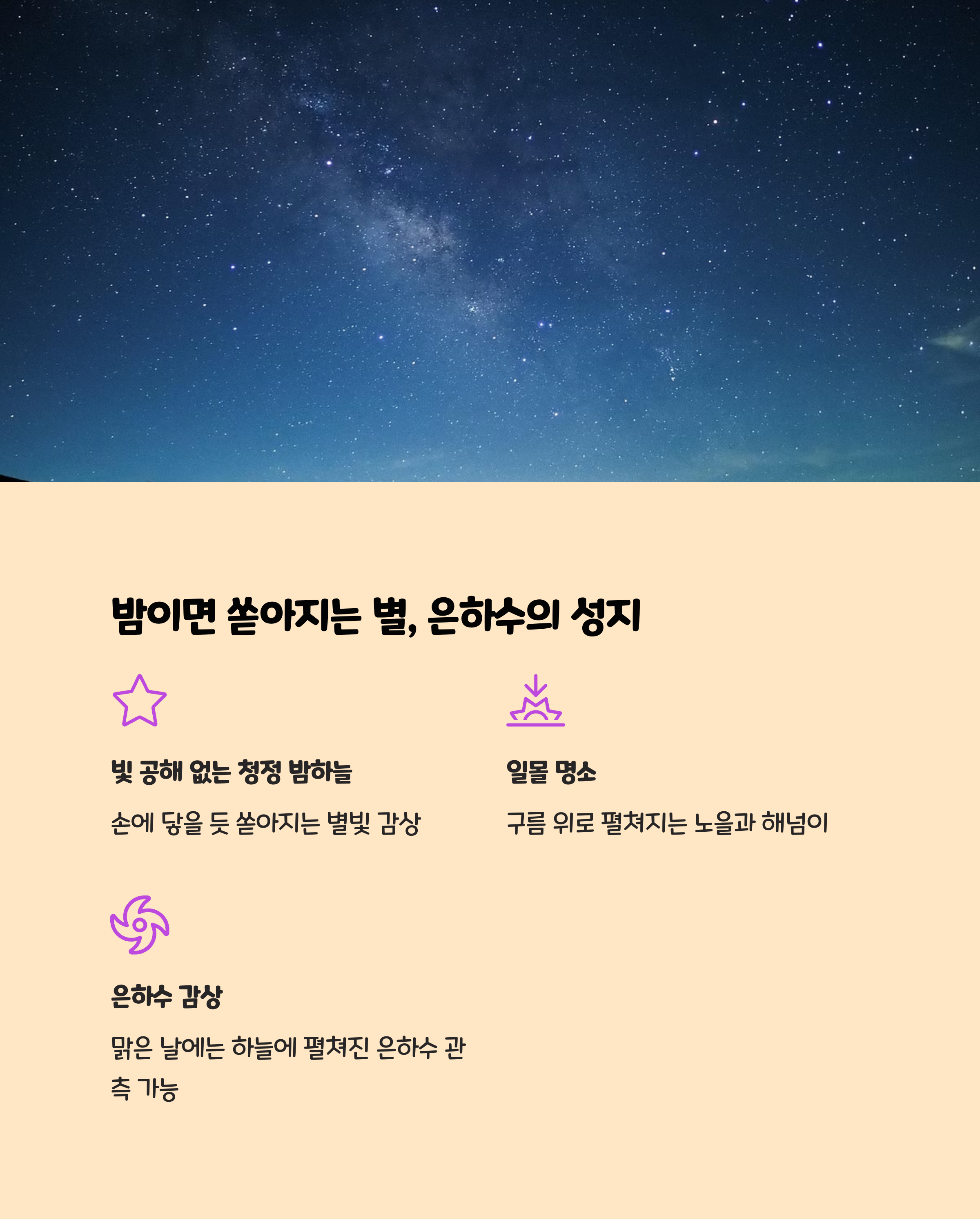 | 고원 초원 절경 | 해발 1,200m에서 펼쳐지는 풍력발전기와 꽃밭, 별빛 풍경이 어우러진 청정 공간 |