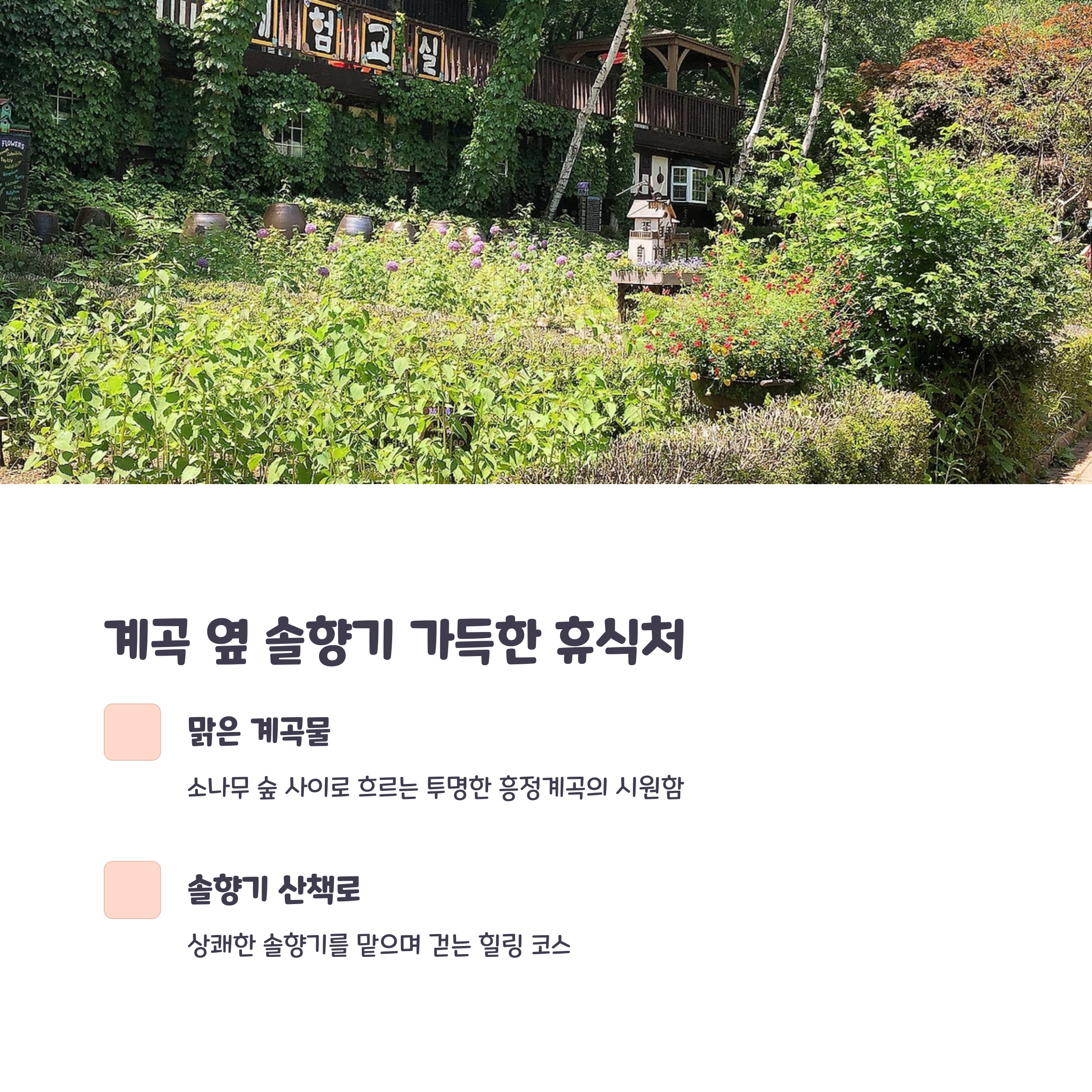 | 흥정계곡과 접해있는 자연형 힐링 공간 | 인생샷 명소 포토존 다수 | 무료 주차장, 온라인 할인 예매 가능 |