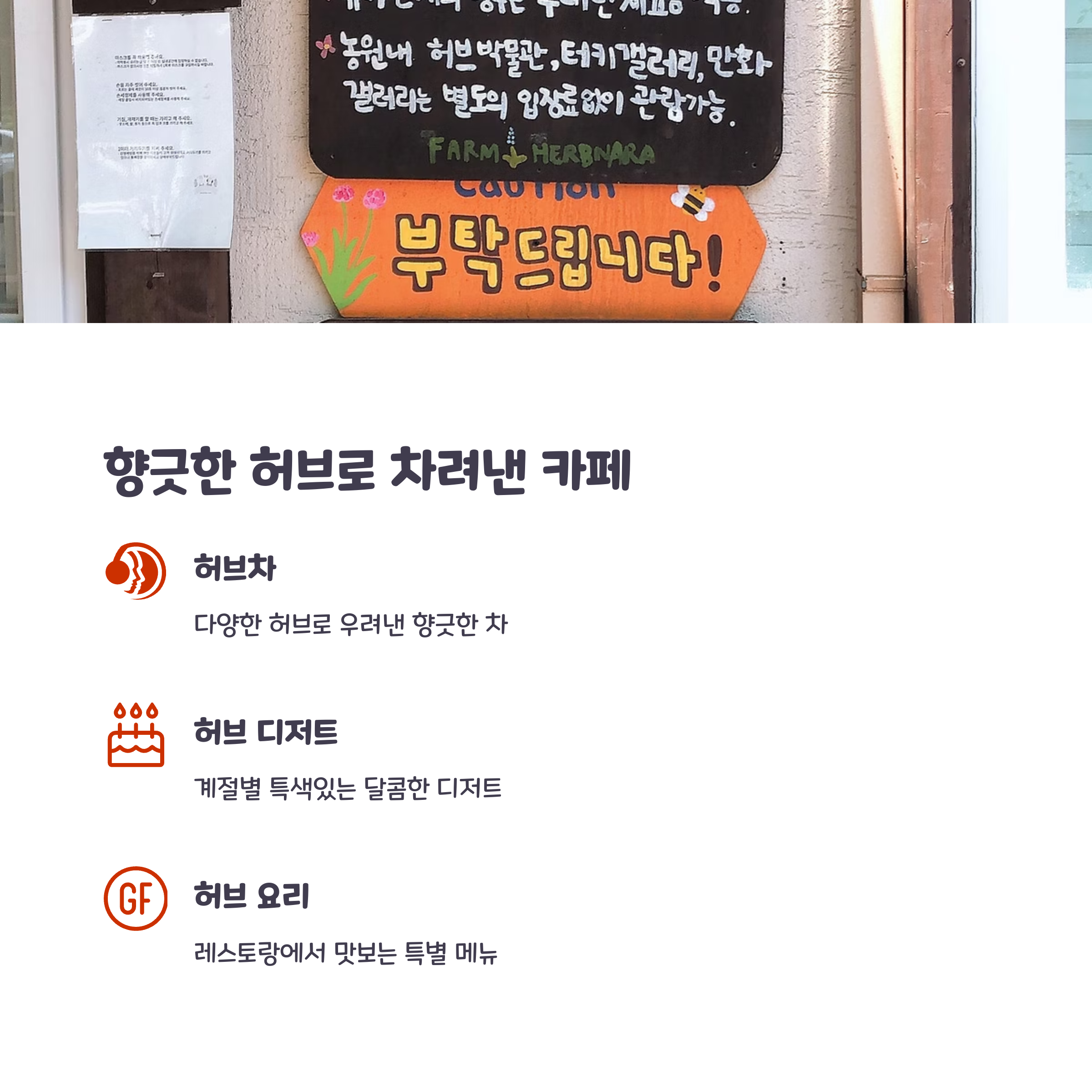 | 강원도 평창군 봉평면 흥정계곡 인근 | 튤립, 철쭉, 꽃사과, 허브정원 | 허브 비누/향수 만들기, 허브차, 무휴 운영 |