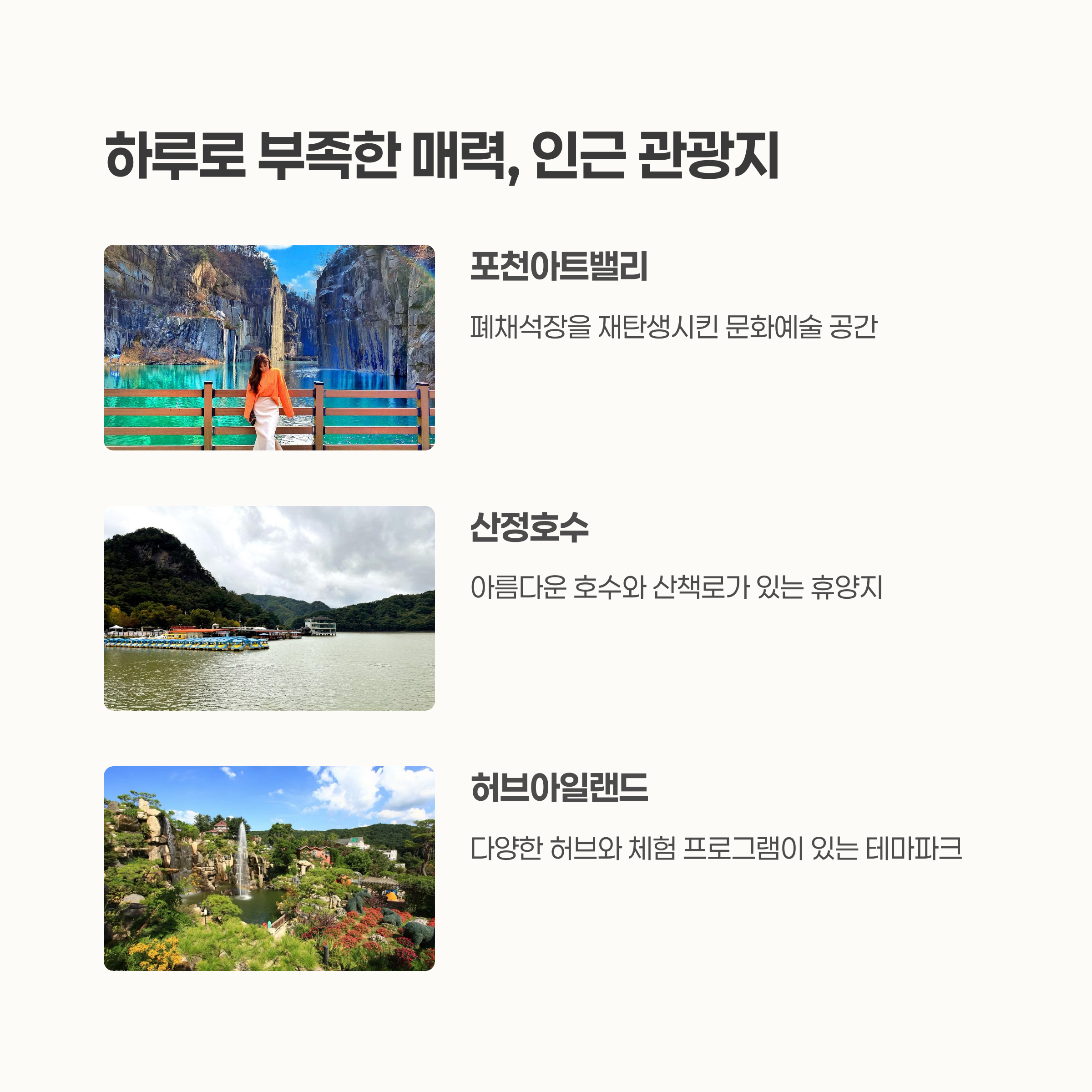 관광지와 연계 여행 아트밸리, 산정호수, 허브아일랜드와 가까움