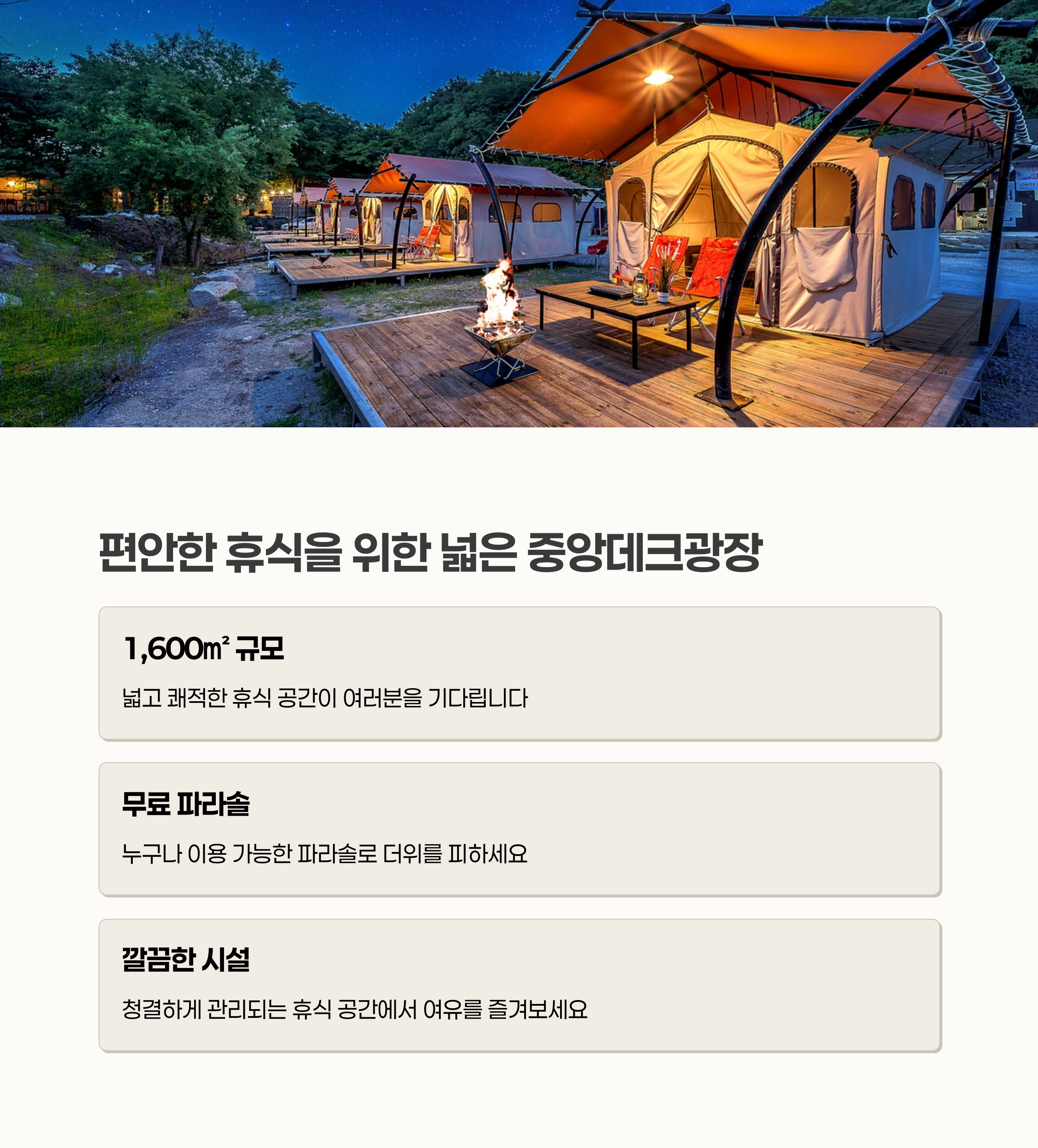 백운계곡의 중앙에는 약 1,600㎡ 규모의 데크 광장이 있어 더운 날씨에도 그늘에서 쾌적한 휴식을 취할 수 있습니다. 특히 광장에는 무료로 사용할 수 있는 파라솔이 설치되어 돗자리 하나면 누구나 손쉽게 쉴 수 있는 피서지가 됩니다. 파라솔 아래서 보내는 여유로운 시간과 계곡물에 발 담그는 기분은 도시에서의 스트레스를 단번에 날려줄 만큼 만족스럽습니다. 또한 인근에 매점, 식당, 화장실 등 기본 편의시설도 갖추어져 있어 하루 종일 머물기에도 불편함이 없습니다.