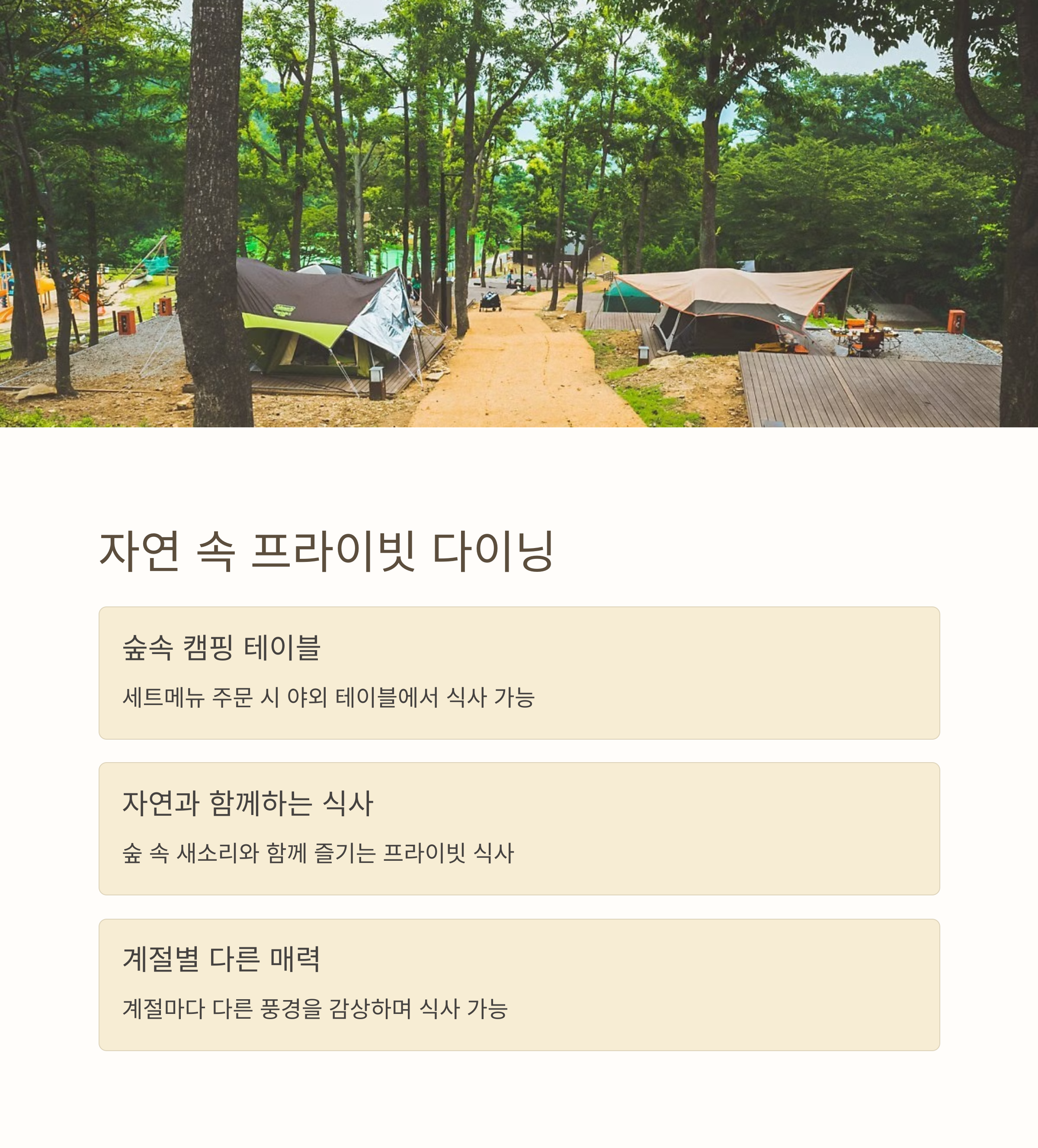 | 풀빌라 숙소 전용 인피니티 수영장 운영 | 브런치, 바비큐 세트, 셰프 디너 메뉴 제공 | 루프탑, 포토존, 숲속 테이블 등 감성 공간 다양 |