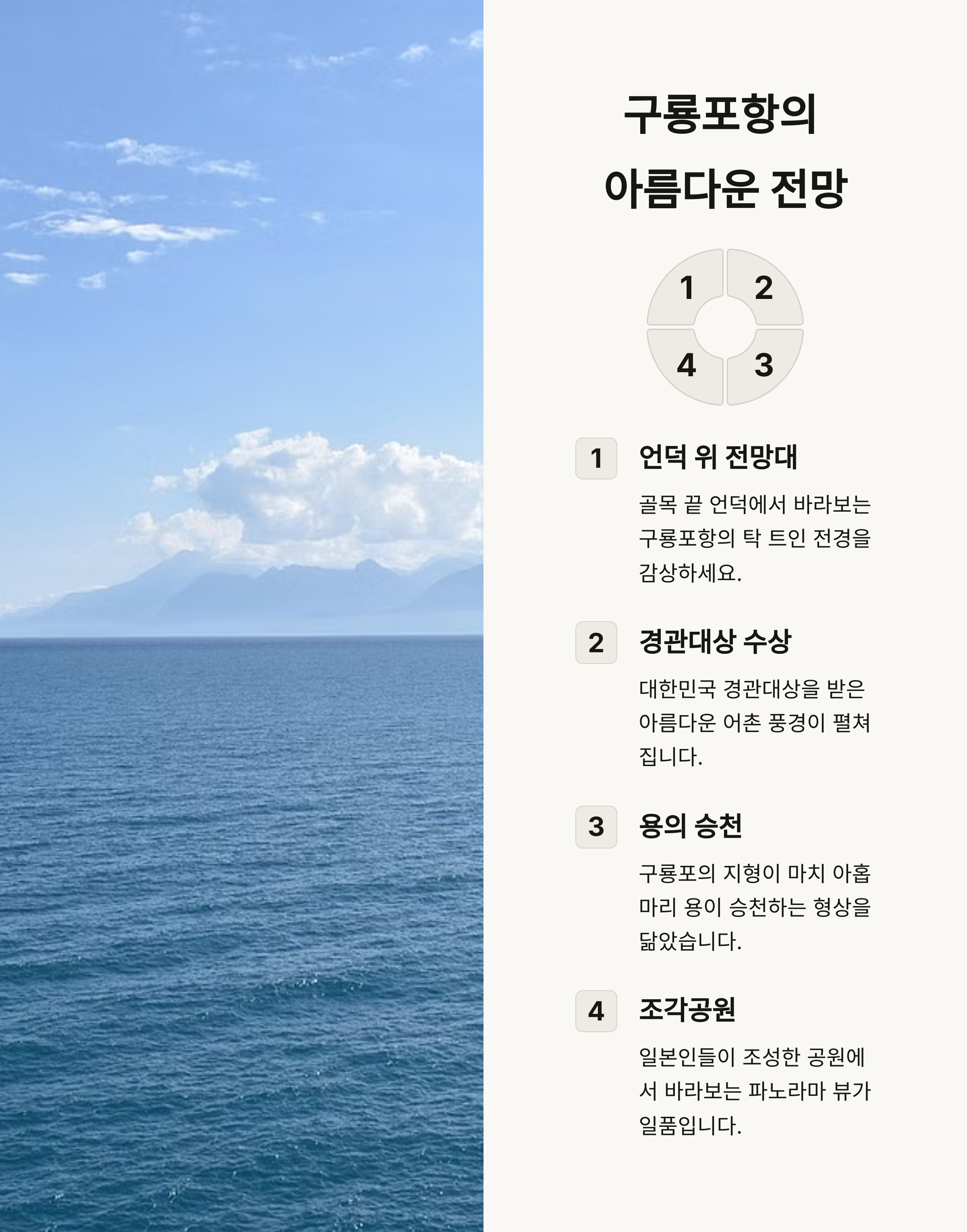 골목 끝 언덕 위에서는 구룡포항과 바다, 조각공원이 한눈에 들어오는 전망이 펼쳐져 산책 마무리 코스로 딱 좋습니다. 주변에는 과메기, 대게 전문점도 많아 맛집 탐방과 함께 코스 구성이 가능합니다. 대중교통 정류장과 주차장도 가까워 차 없이도 부담 없는 도보 여행지입니다.