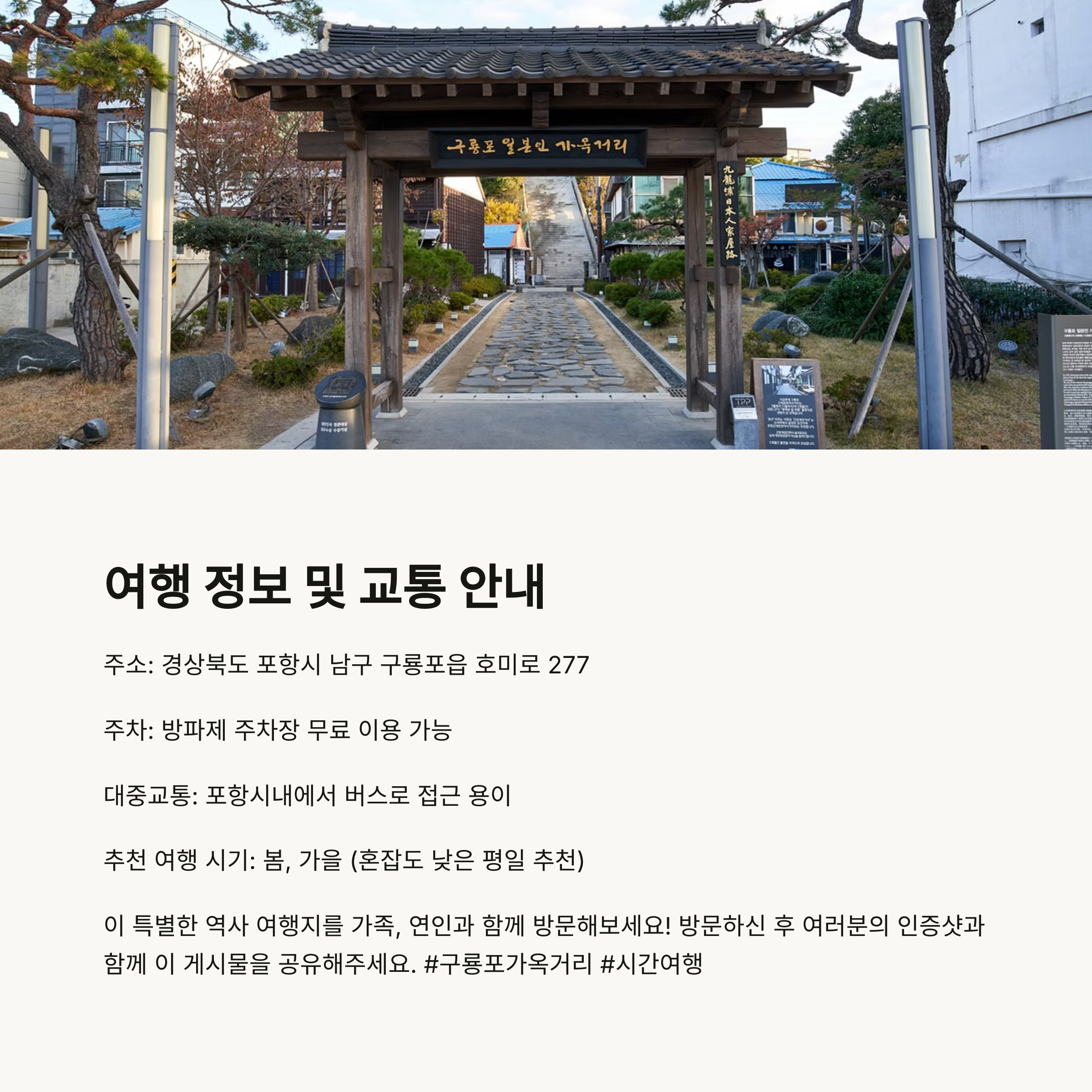 포항 구룡포 일본인 가옥거리는 역사와 감성, 드라마 속 추억이 함께 공존하는 골목입니다. 천천히 걷고, 사진 찍고, 당시 사람들의 삶을 느끼며 여유로운 도보 여행의 매력을 느껴보세요. 근처 맛집과 항구 풍경까지 더하면 완벽한 하루 코스가 됩니다.