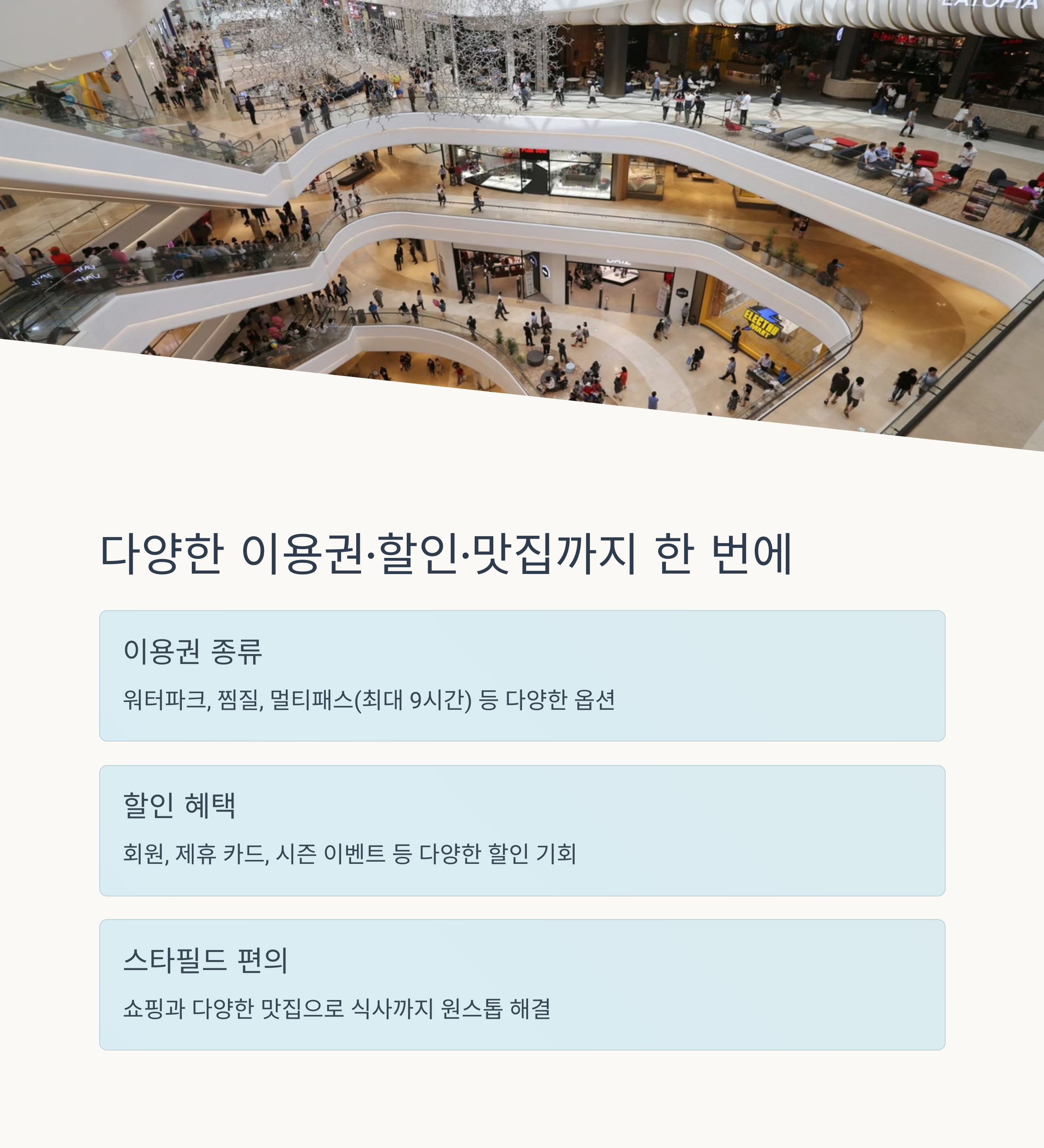 날씨 걱정 없이 온종일 실내에서 놀고 쉬고 힐링하고 싶다면 하남 스타필드 아쿠아필드가 최고의 선택입니다. 워터파크와 찜질스파, 쇼핑과 식사까지 모두 해결 가능한 완벽한 실내 데이트 코스를 찾고 있다면 지금 바로 방문해보세요!