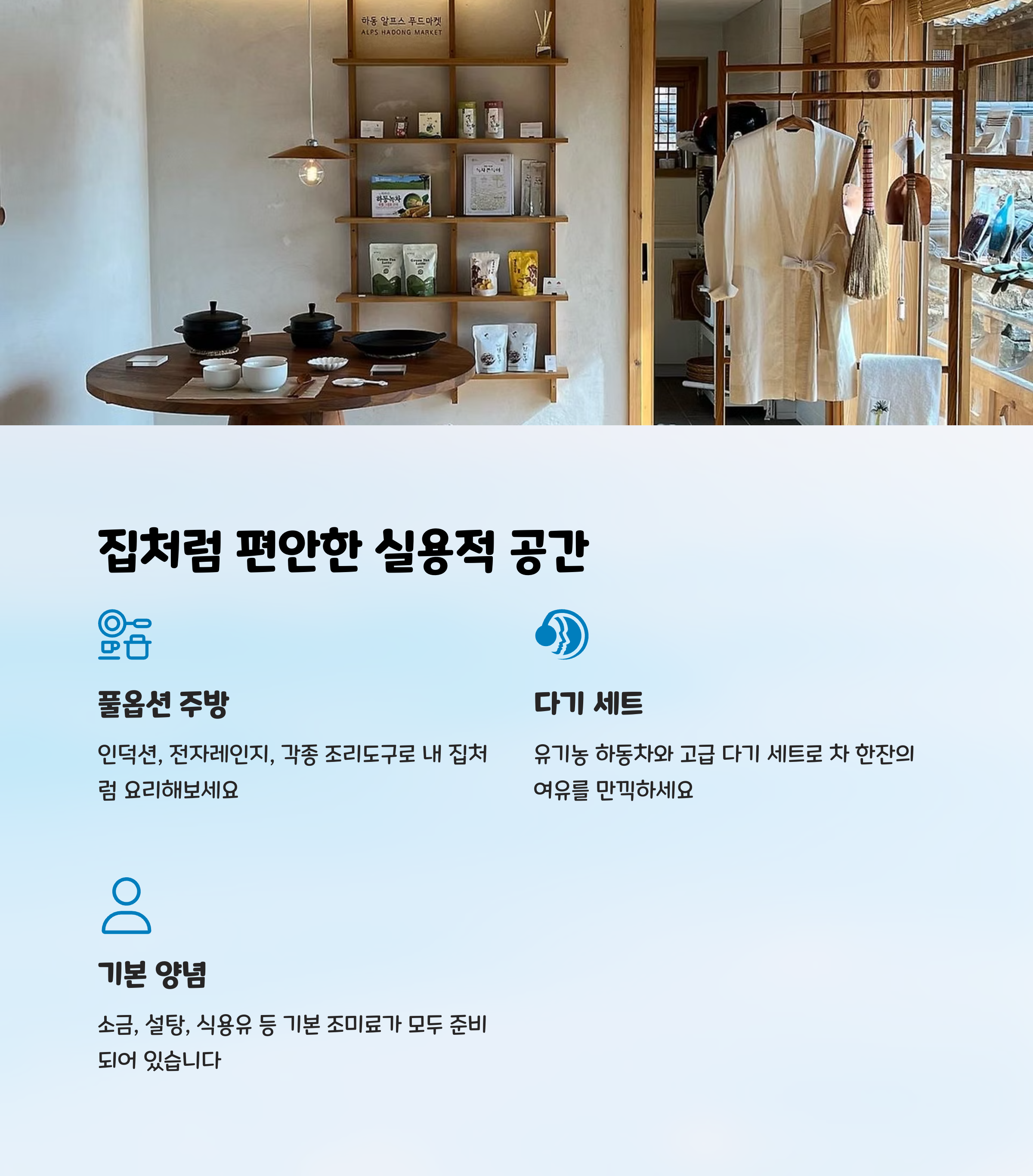 유로제다는 녹차밭 풍경을 가장 가까이에서 만날 수 있는 감성 숙소로, 창문과 테라스 어디서든 푸른 차밭과 지리산 능선이 어우러진 장관을 감상할 수 있습니다. 객실 내부는 감각적인 미니멀 인테리어로 꾸며져 있으며 넓은 창과 원목 가구가 어우러져 자연친화적인 분위기를 자아냅니다. 실내에는 주방과 기본 조리도구, 전기레인지, 다기세트, 유기농 하동 녹차가 마련되어 있어 간단한 식사와 다도 체험이 가능하며 따뜻한 차 한 잔으로 마음까지 힐링할 수 있습니다.