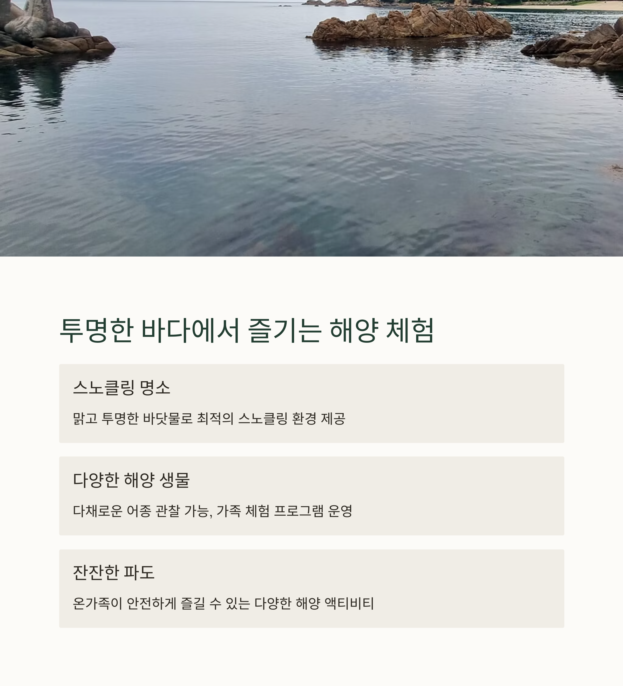 어린이도 안심하고 물놀이 가능 수중 생태를 관찰할 수 있는 깨끗한 바다 휴식과 그늘을 제공하는 자연 차광막