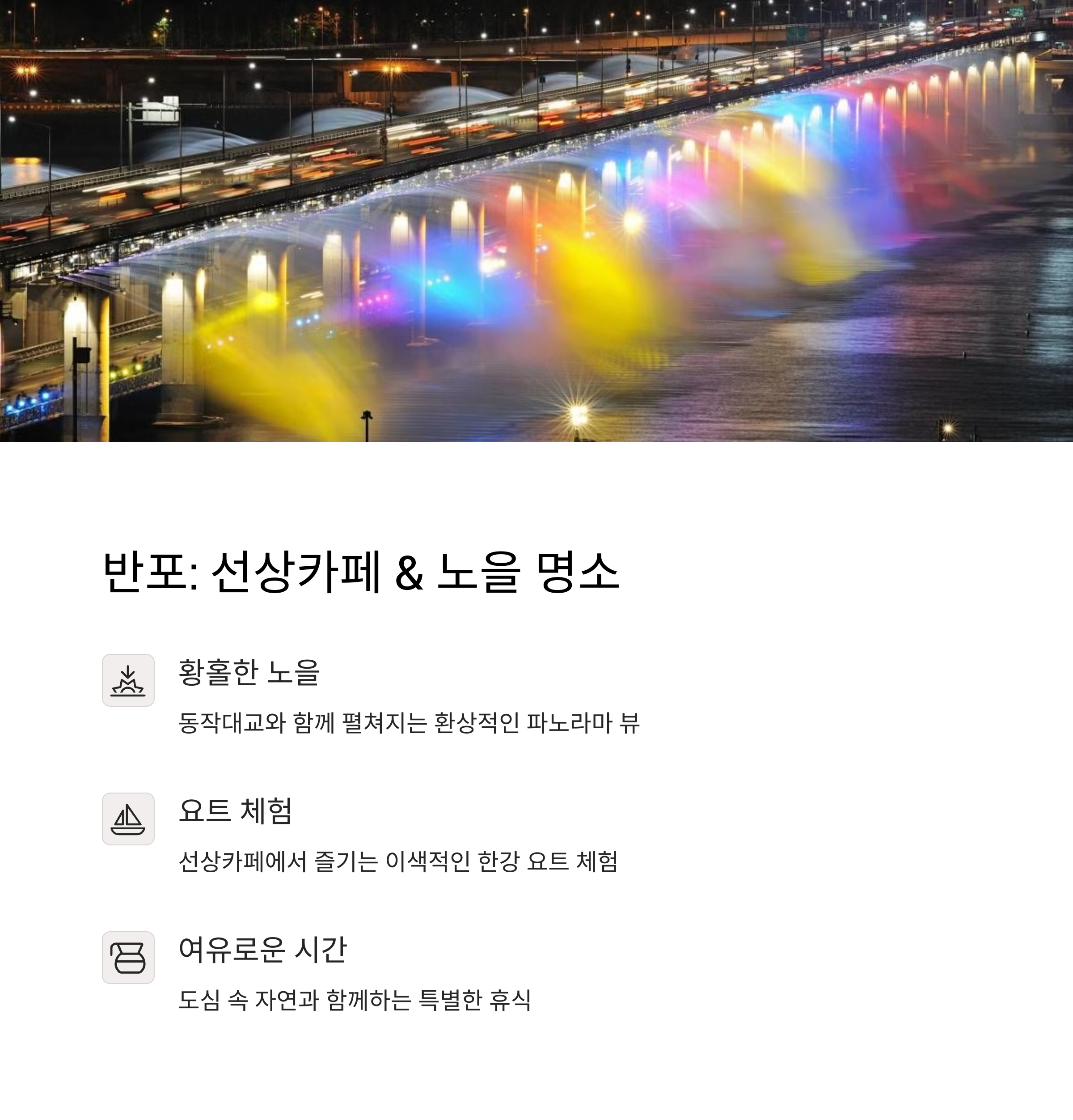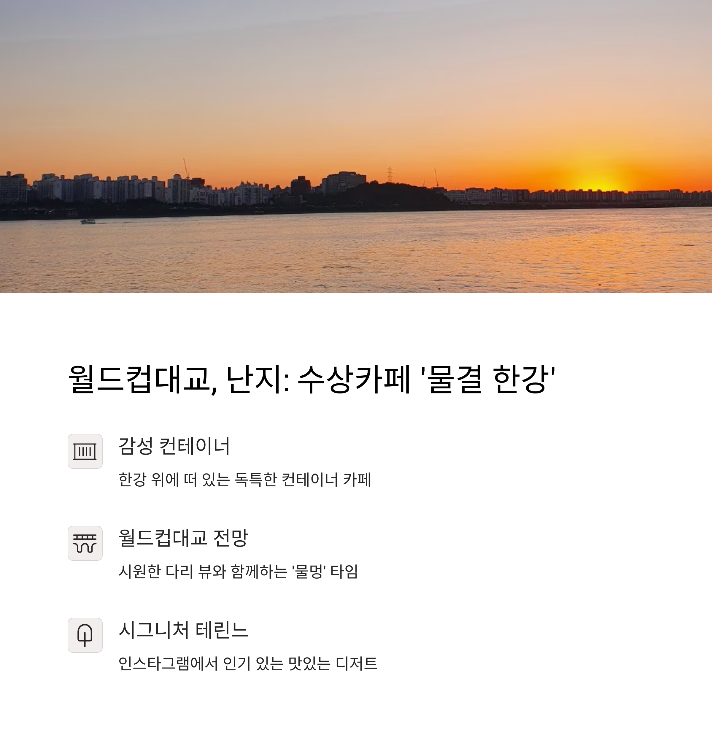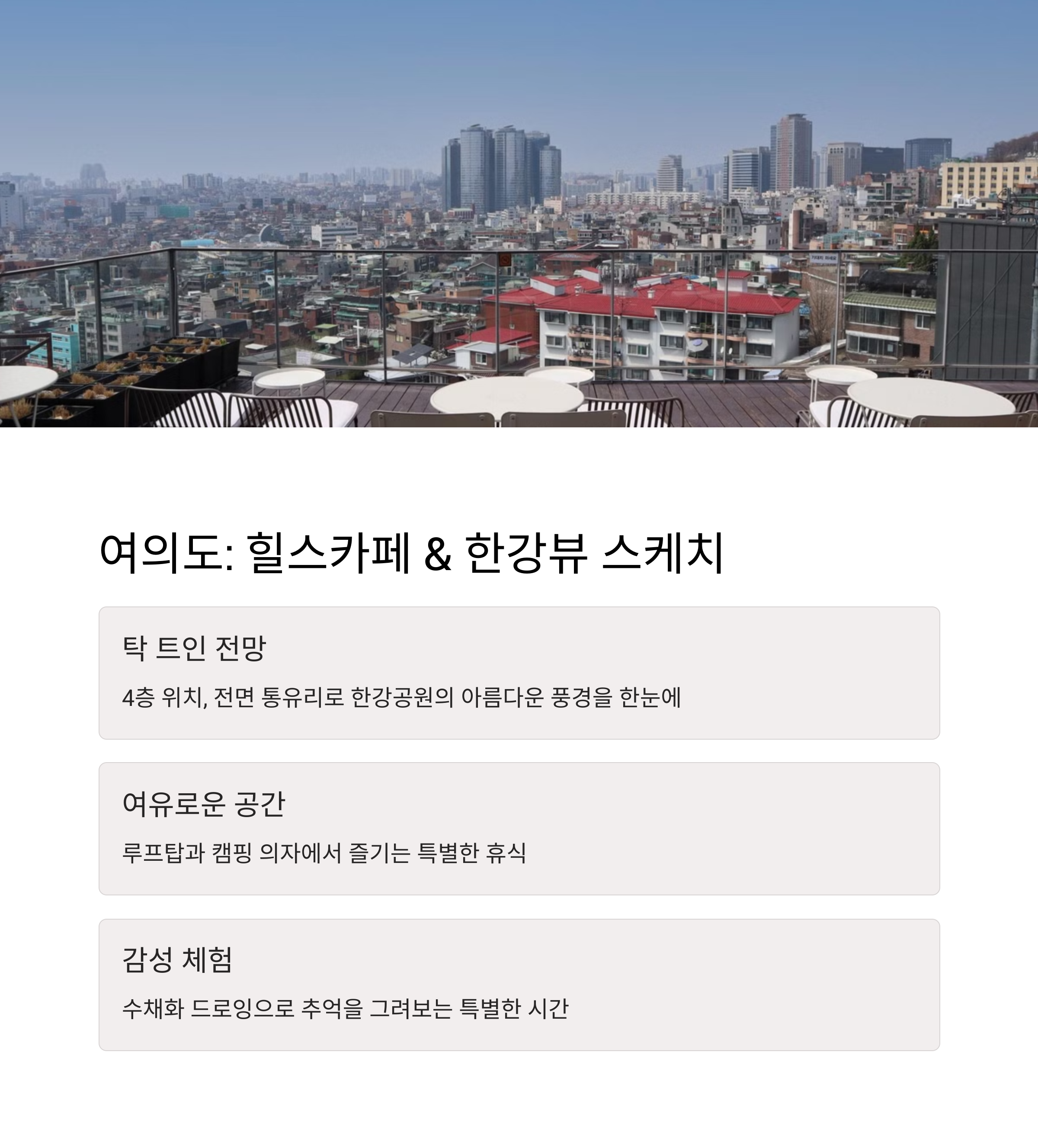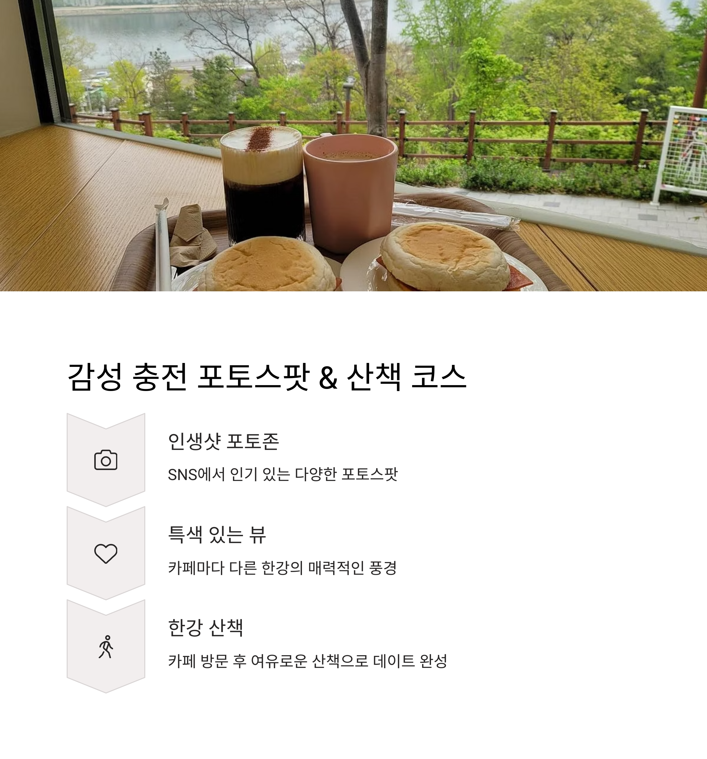 | 한강 감성 카페 | 탁 트인 전망과 감성적인 분위기에서 즐기는 티타임 |