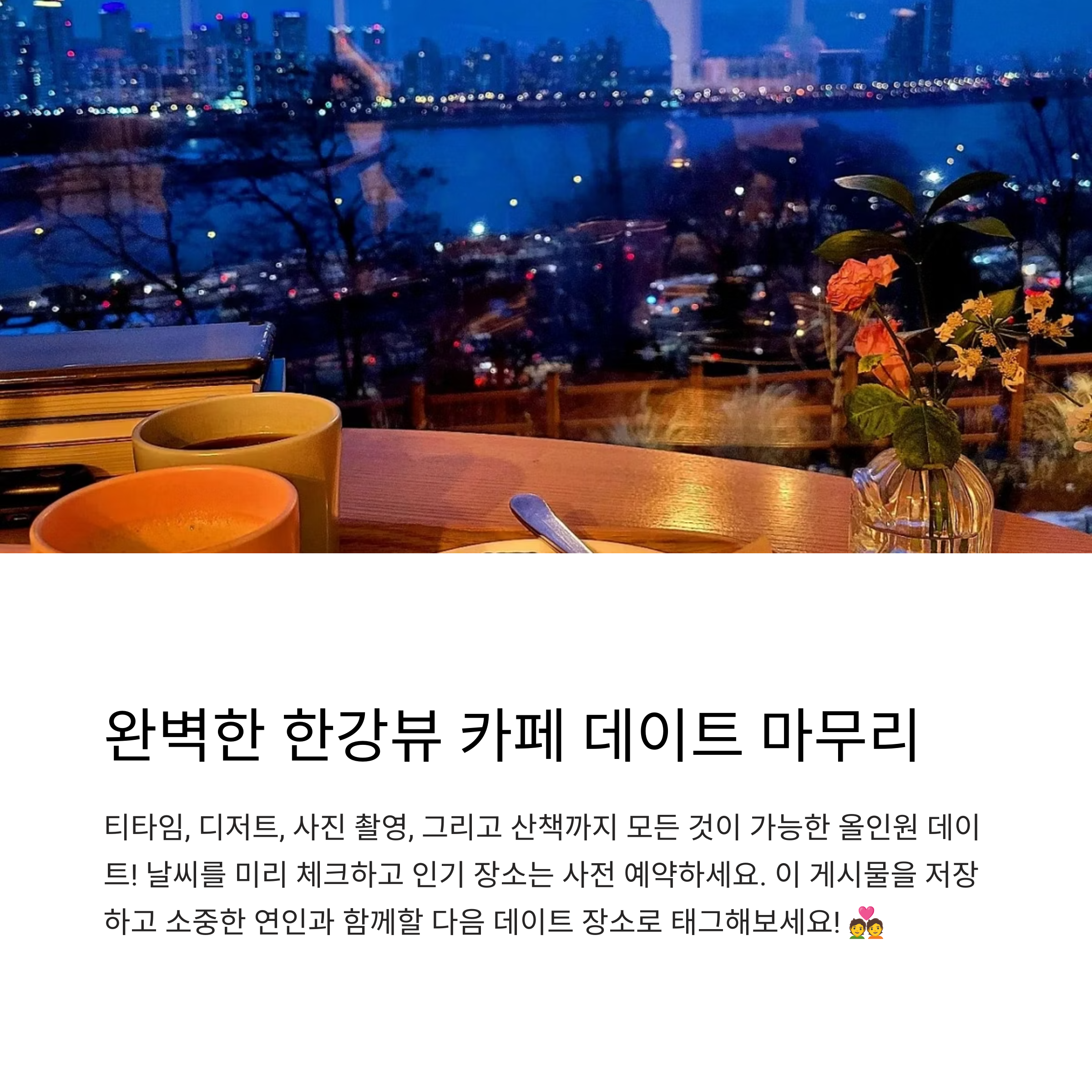 여러분이 다녀온 감성 카페는 어디인가요? 또는 추천하고 싶은 한강 뷰 명소가 있다면 댓글로 공유해주세요. 서로의 이야기를 나누며 더 멋진 데이트 코스를 함께 만들어봐요!