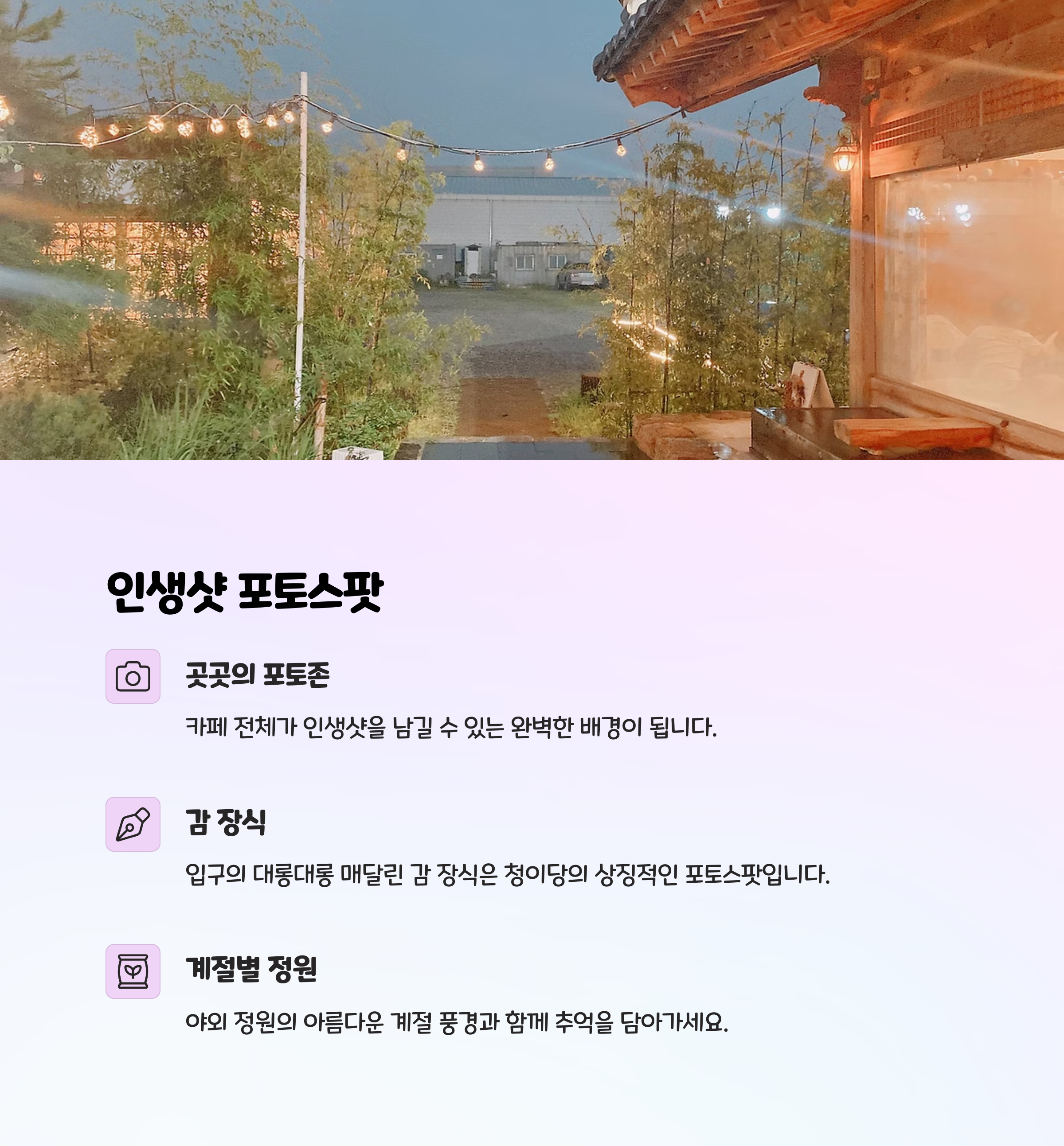 의왕 청이당은 단순히 카페를 넘어 공간 자체가 힐링이 되는 감성 명소입니다. 한옥이 주는 고즈넉함, 정성이 담긴 메뉴, 조용한 분위기와 세련된 구성은 누구와 함께하든 특별한 시간을 선사합니다. 단체 모임, 연인 데이트, 또는 혼자만의 여유까지도 모두 만족할 수 있는 구성이기에 평소 감성 있는 공간을 찾고 계셨다면 꼭 한 번 들러보시길 추천드립니다.