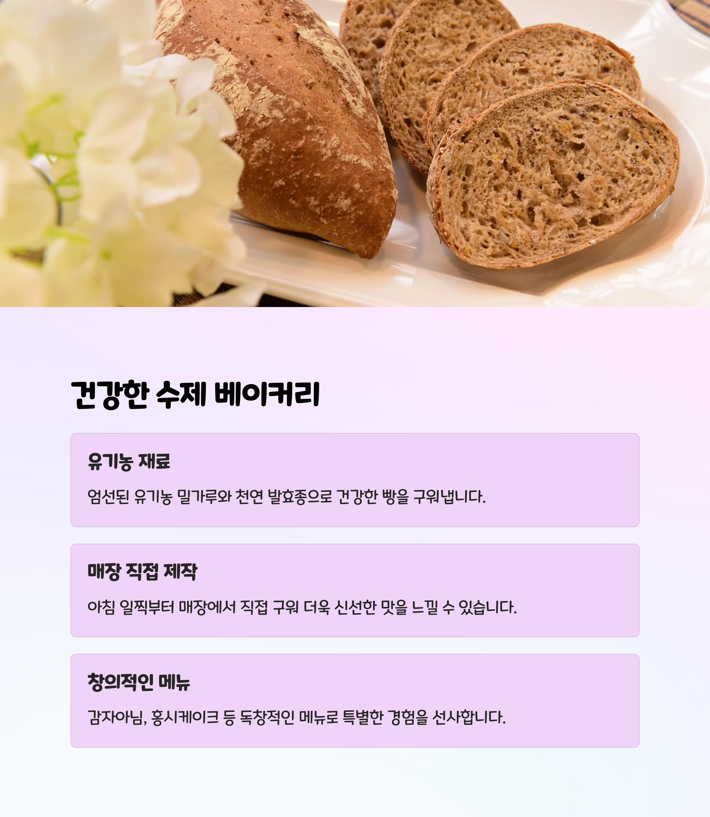 이곳에서 가장 주목할 점은 바로 베이커리 메뉴입니다. 유기농 밀가루와 천연 발효종을 사용하여 정성껏 만든 빵은 기본적인 맛부터 특별한 재료가 더해진 개성 있는 메뉴까지 다양하게 준비되어 있습니다. 특히 감자아님, 홍시케이크, 호박식혜 같은 메뉴는 흔히 접할 수 없는 독특한 맛을 제공하며, 한옥의 분위기와 잘 어울려 이곳을 더욱 특별하게 만들어줍니다.