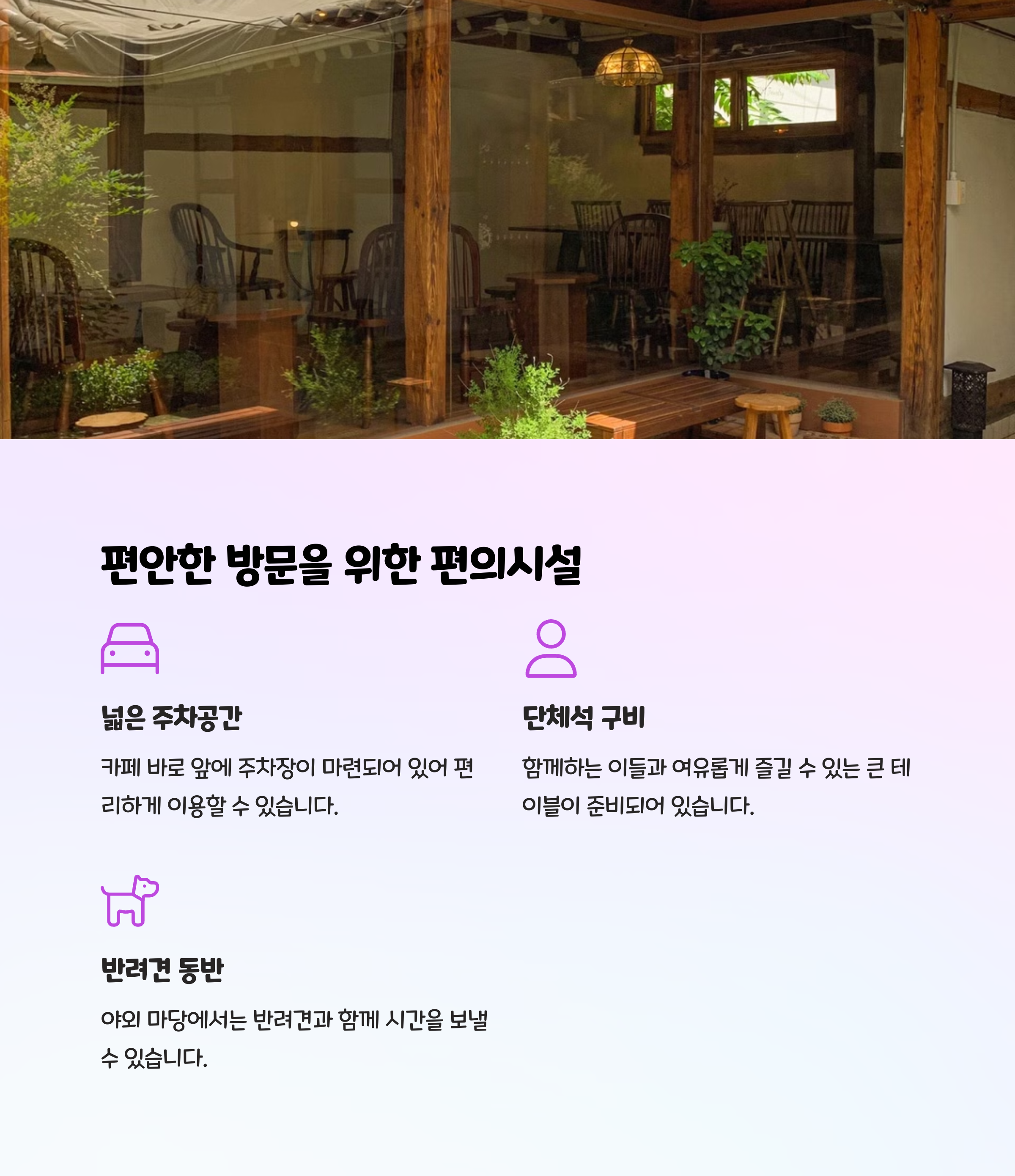 | 마당과 통창, 테라스 공간까지 완비 | 전통과 현대가 어우러진 독특한 구성 | 붐비지 않는 시간대에 감성 카페 즐기기 |