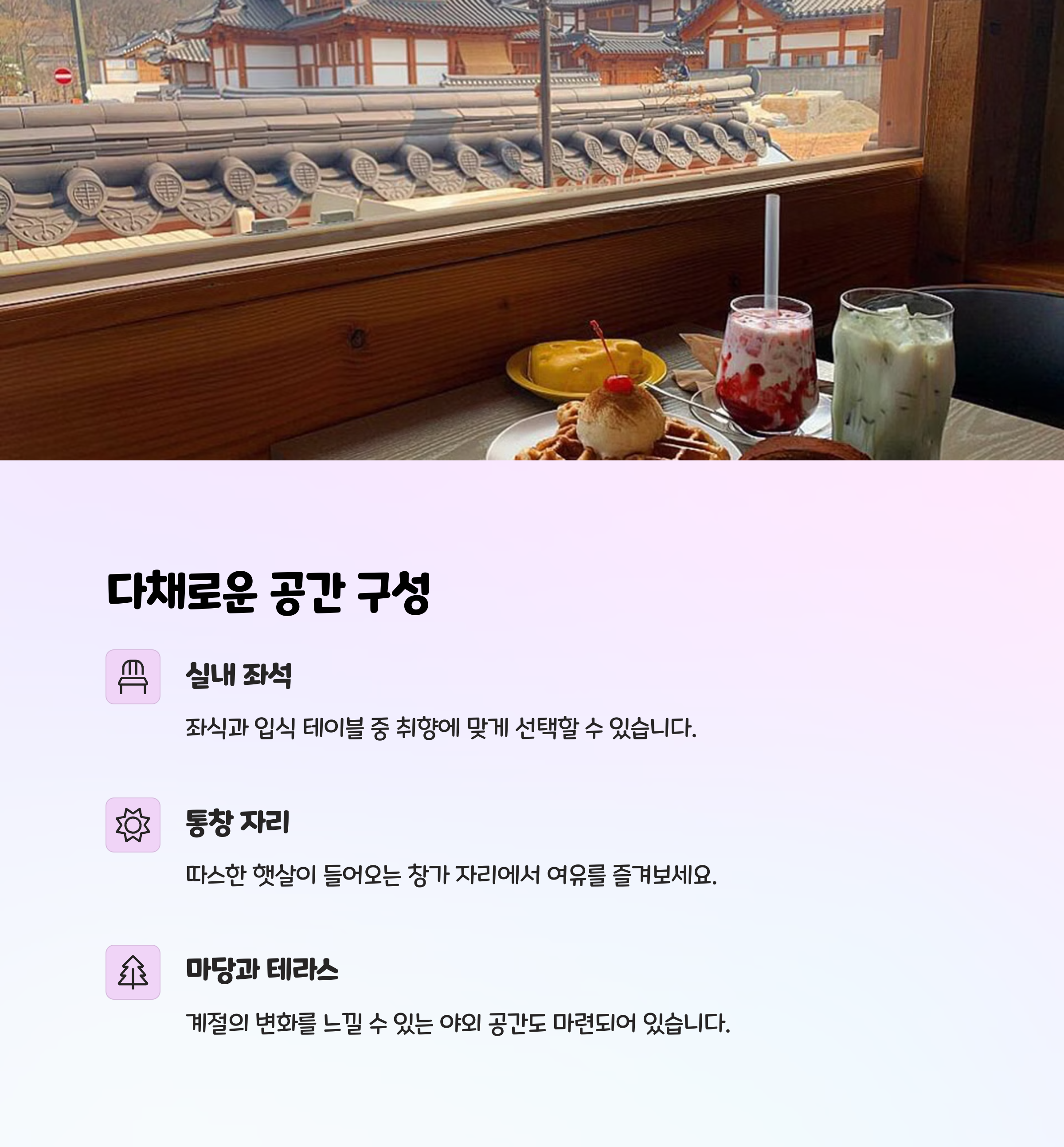 | 한옥 분위기 | 시그니처 메뉴 | 추천 방문 시간 |