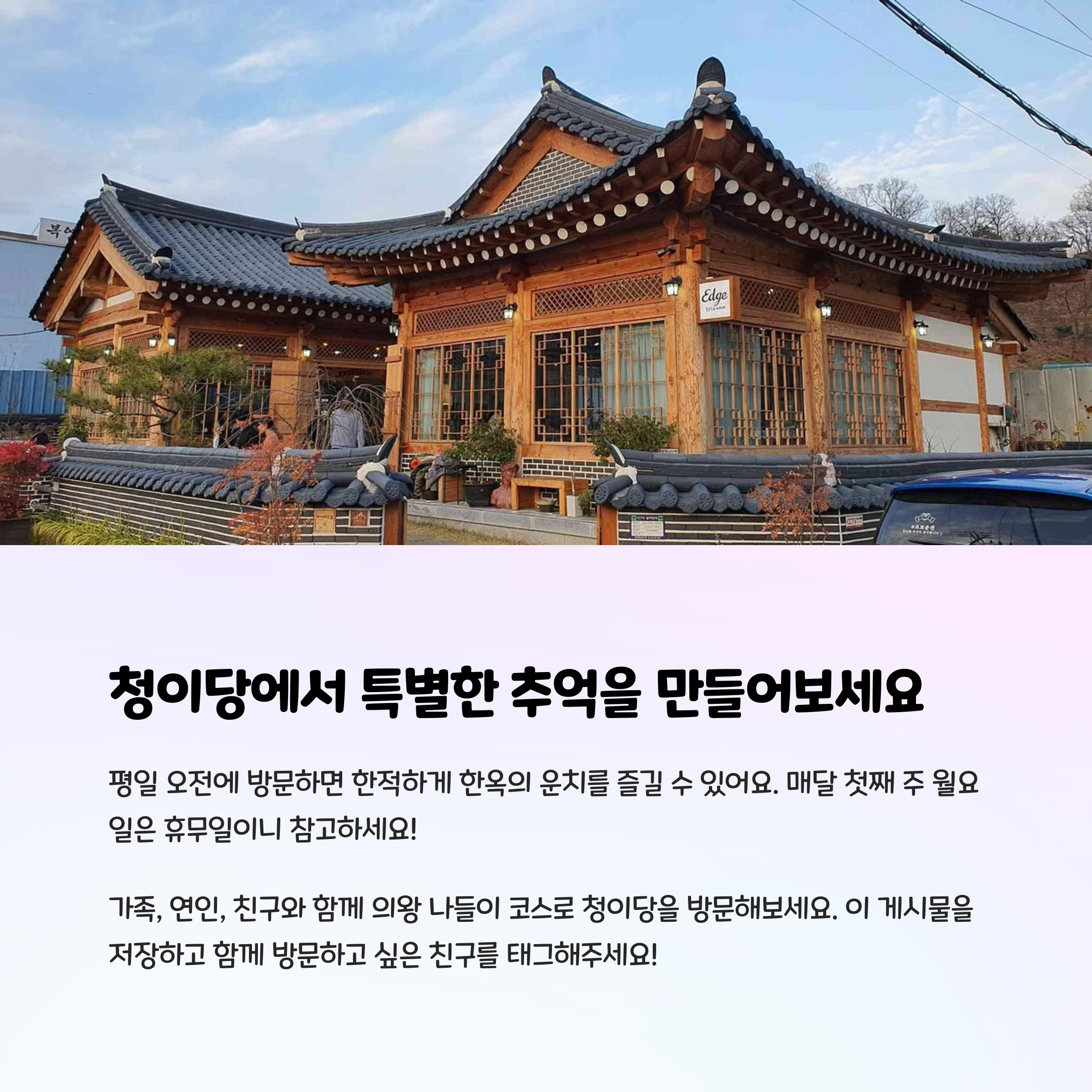 의왕 청이당은 단순히 카페를 넘어 공간 자체가 힐링이 되는 감성 명소입니다. 한옥이 주는 고즈넉함, 정성이 담긴 메뉴, 조용한 분위기와 세련된 구성은 누구와 함께하든 특별한 시간을 선사합니다. 단체 모임, 연인 데이트, 또는 혼자만의 여유까지도 모두 만족할 수 있는 구성이기에 평소 감성 있는 공간을 찾고 계셨다면 꼭 한 번 들러보시길 추천드립니다.