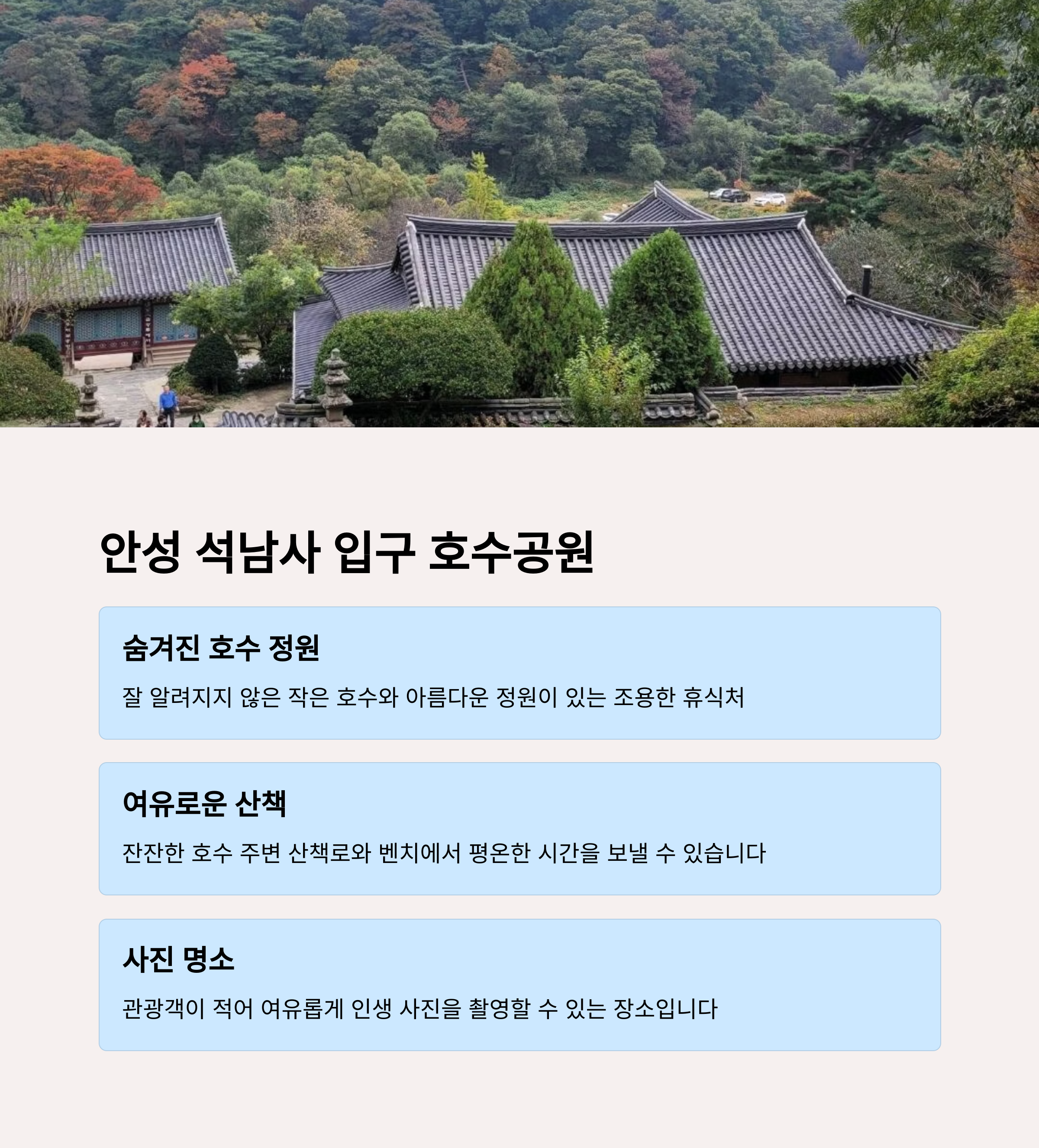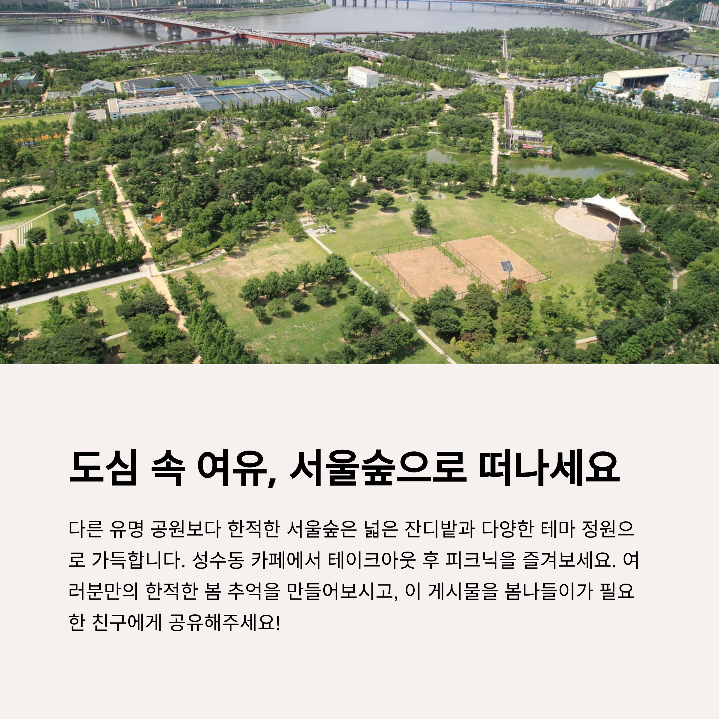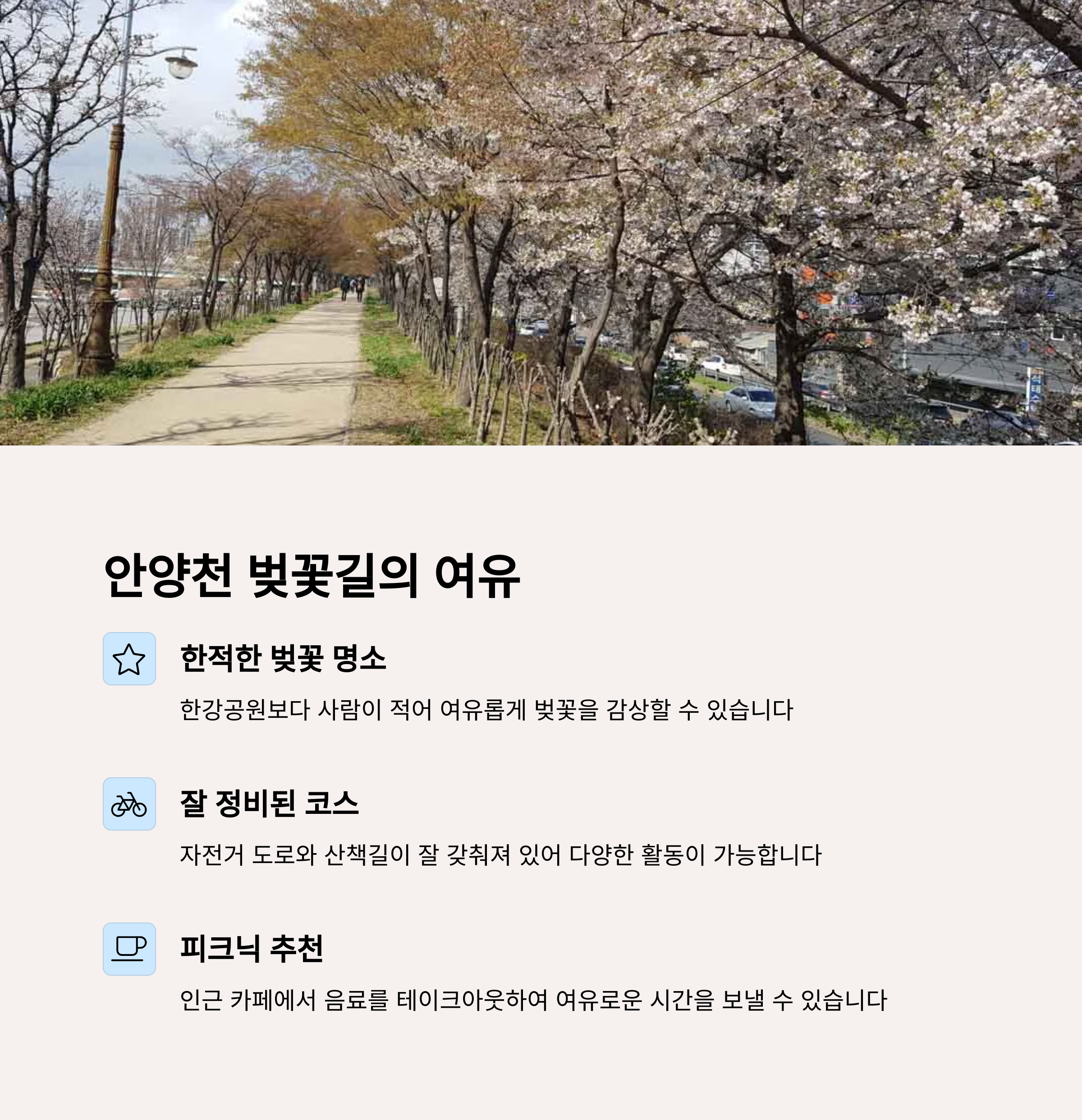 | 안양천 벚꽃길, 자전거와 산책 조화 | 안성 석남사 입구, 작은 호수공원 | 서울숲, 잔디+숲+카페거리 조용한 피크닉 |
