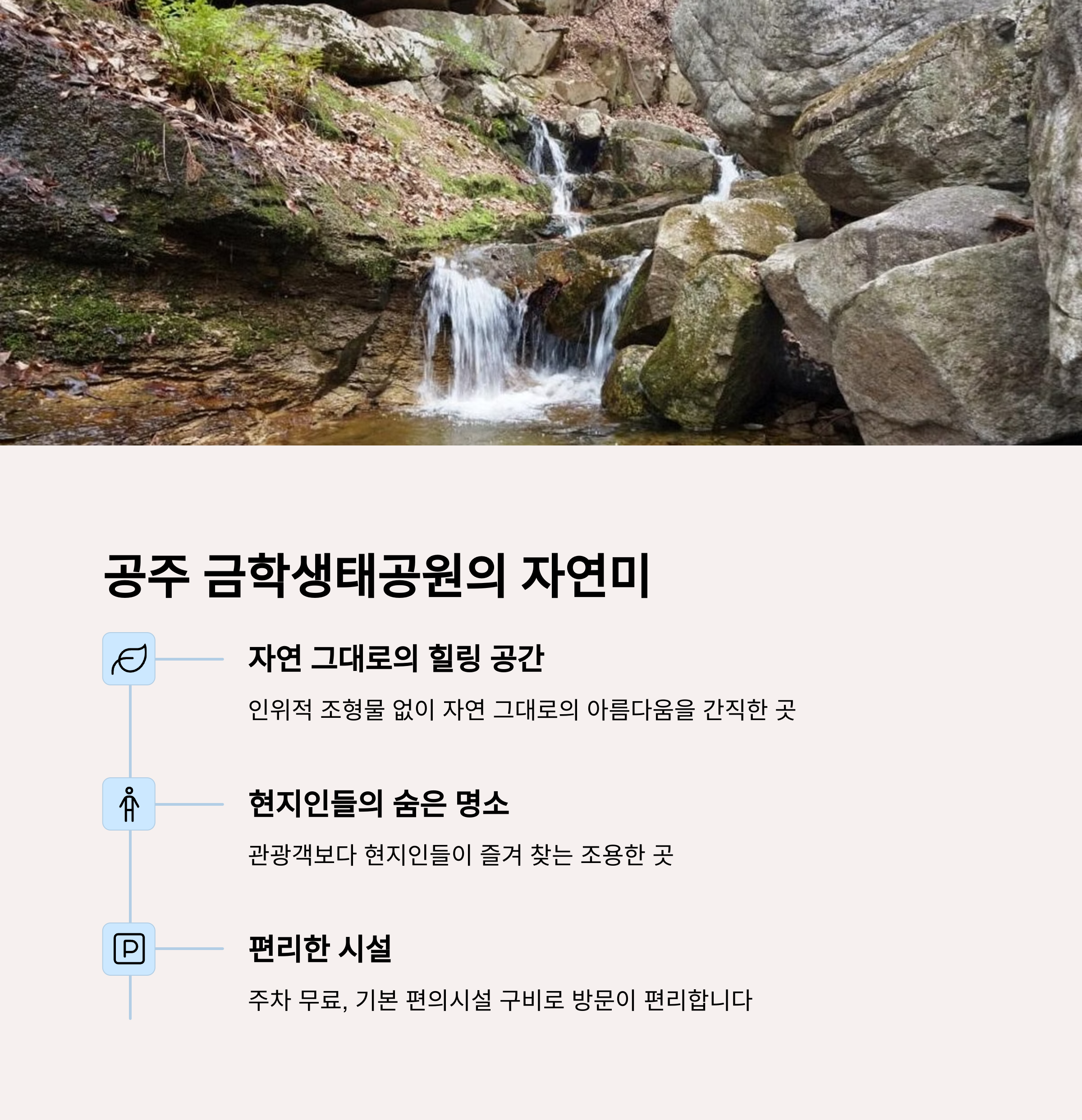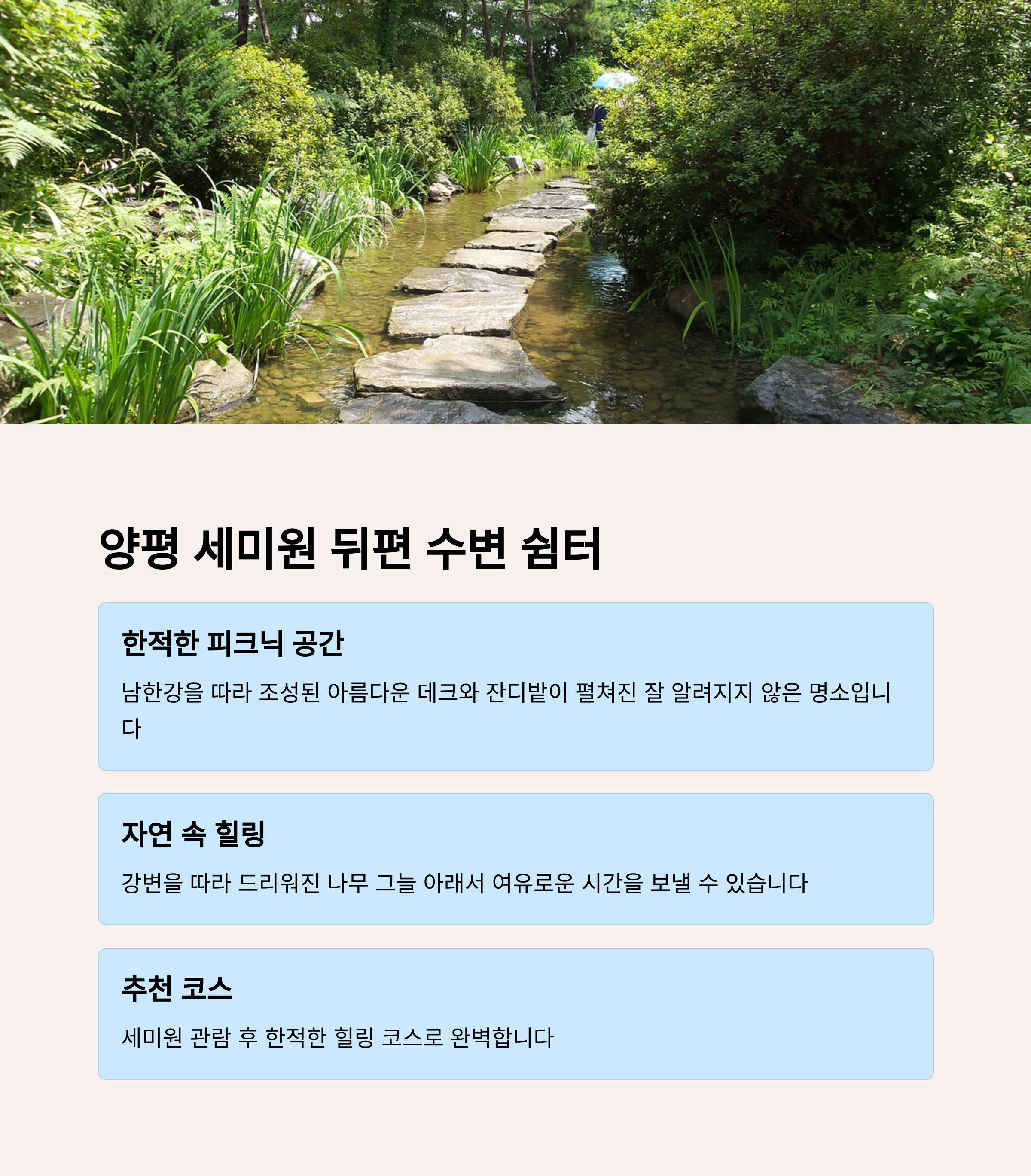 | 추천 키워드 | 조용한 산책길, 숲속 힐링, 피크닉 쉼터, 관광객 적은 장소 |