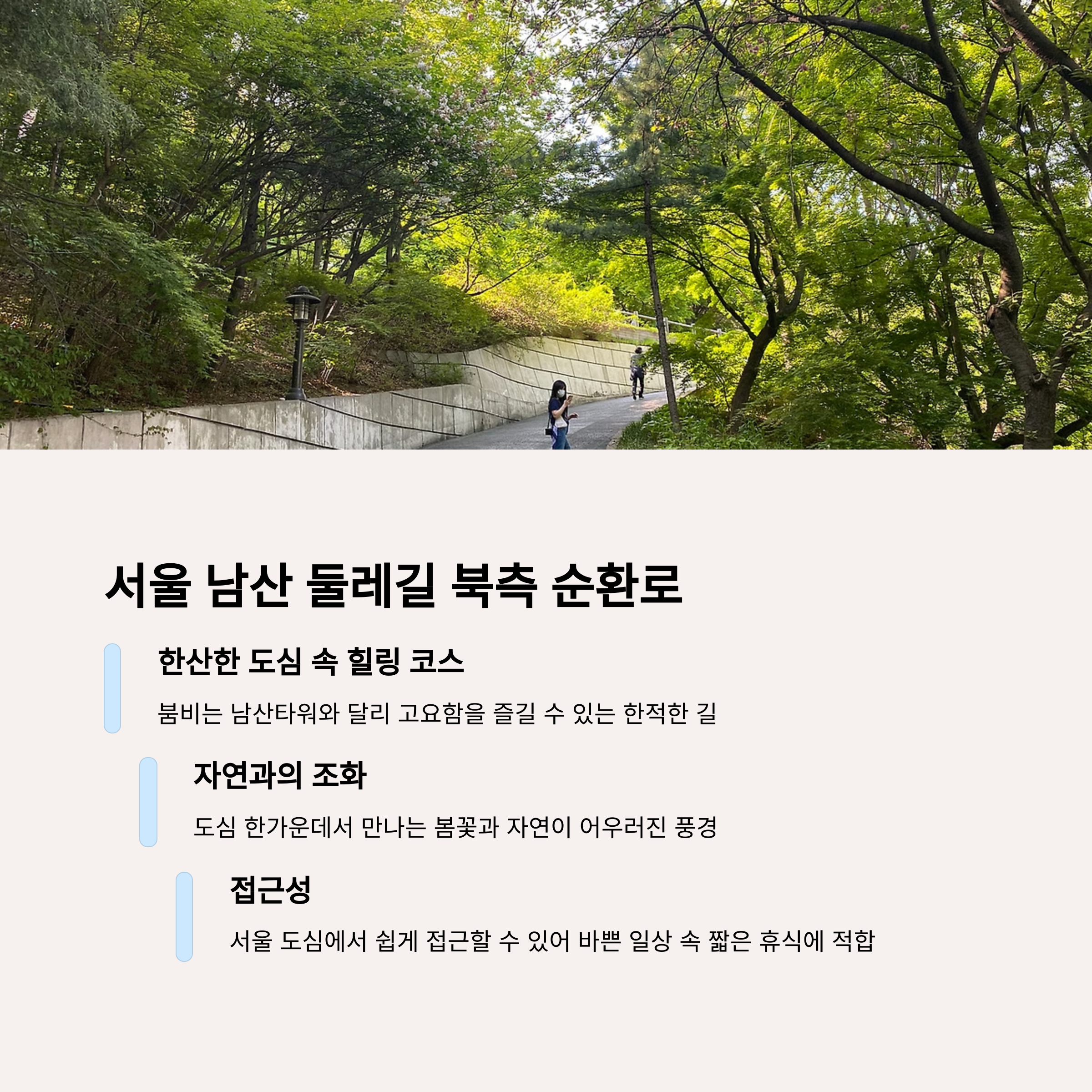| 공주 영평사, 겹벚꽃 산사 산책 | 양평 세미원 뒤 쉼터, 강 따라 피크닉 | 남산 북측 순환로, 한산한 데크 산책 |