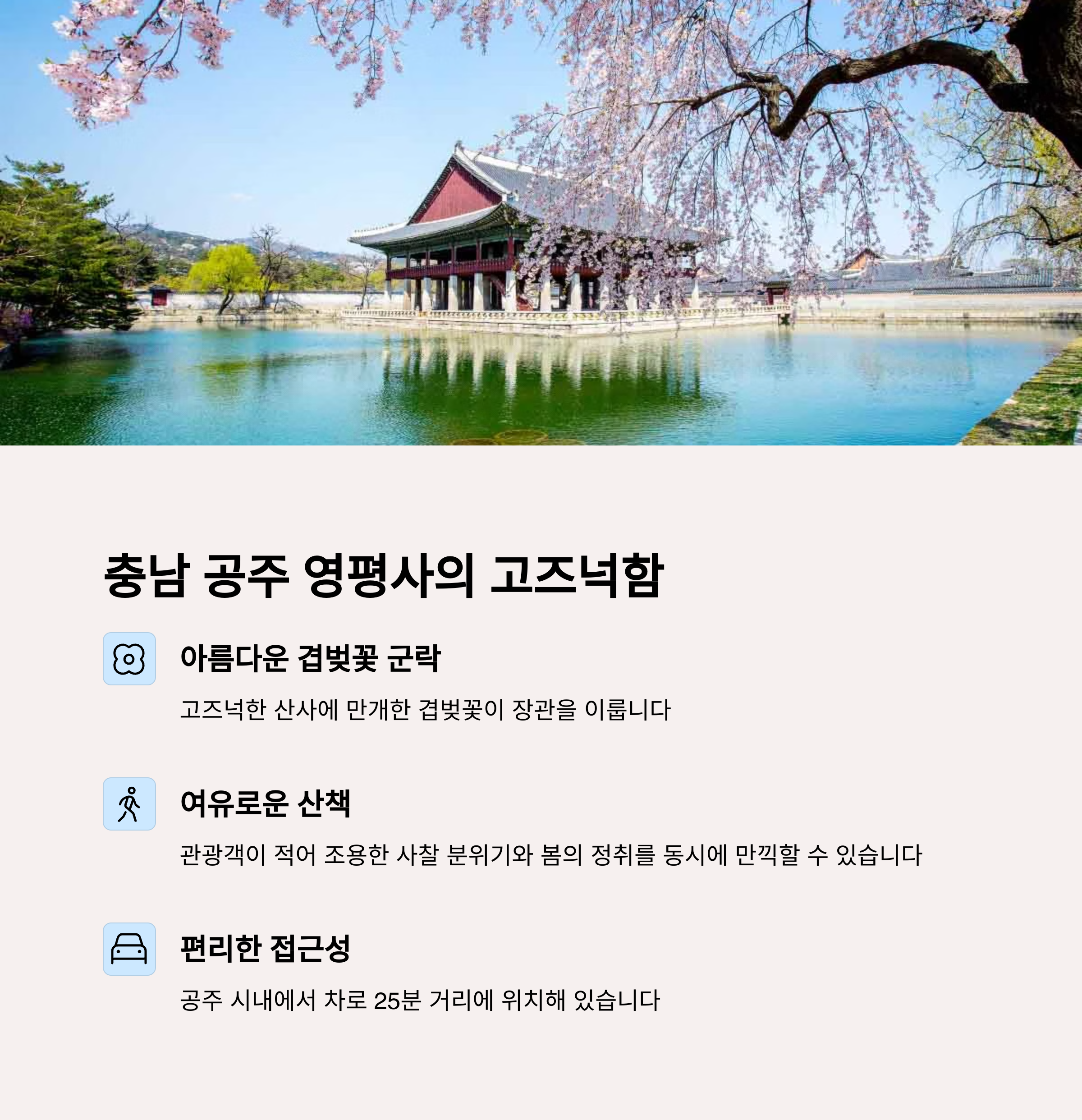 충남 공주 영평사는 겹벚꽃이 아름답게 피어나는 조용한 산사로, 복잡한 도심을 벗어나 깊은 봄의 정취를 느끼기에 좋은 장소입니다. 벚꽃이 화려하게 피지만 관광객은 적어 사색이나 산책을 즐기기에 최적이며, 고요한 분위기의 전각과 숲길이 인상적이에요. 붐비지 않는 숨은 벚꽃 명소를 찾는다면 이곳이 제격입니다.
