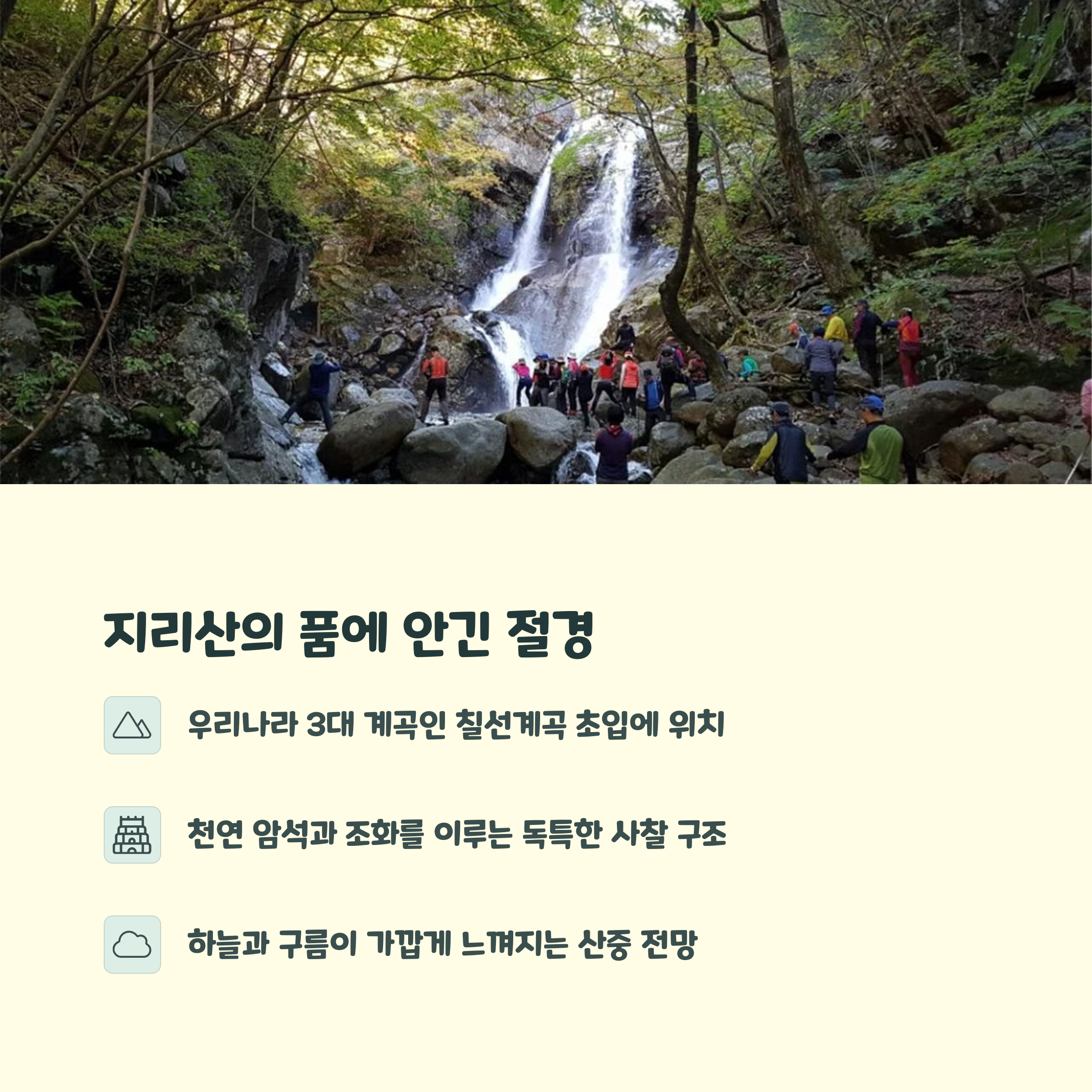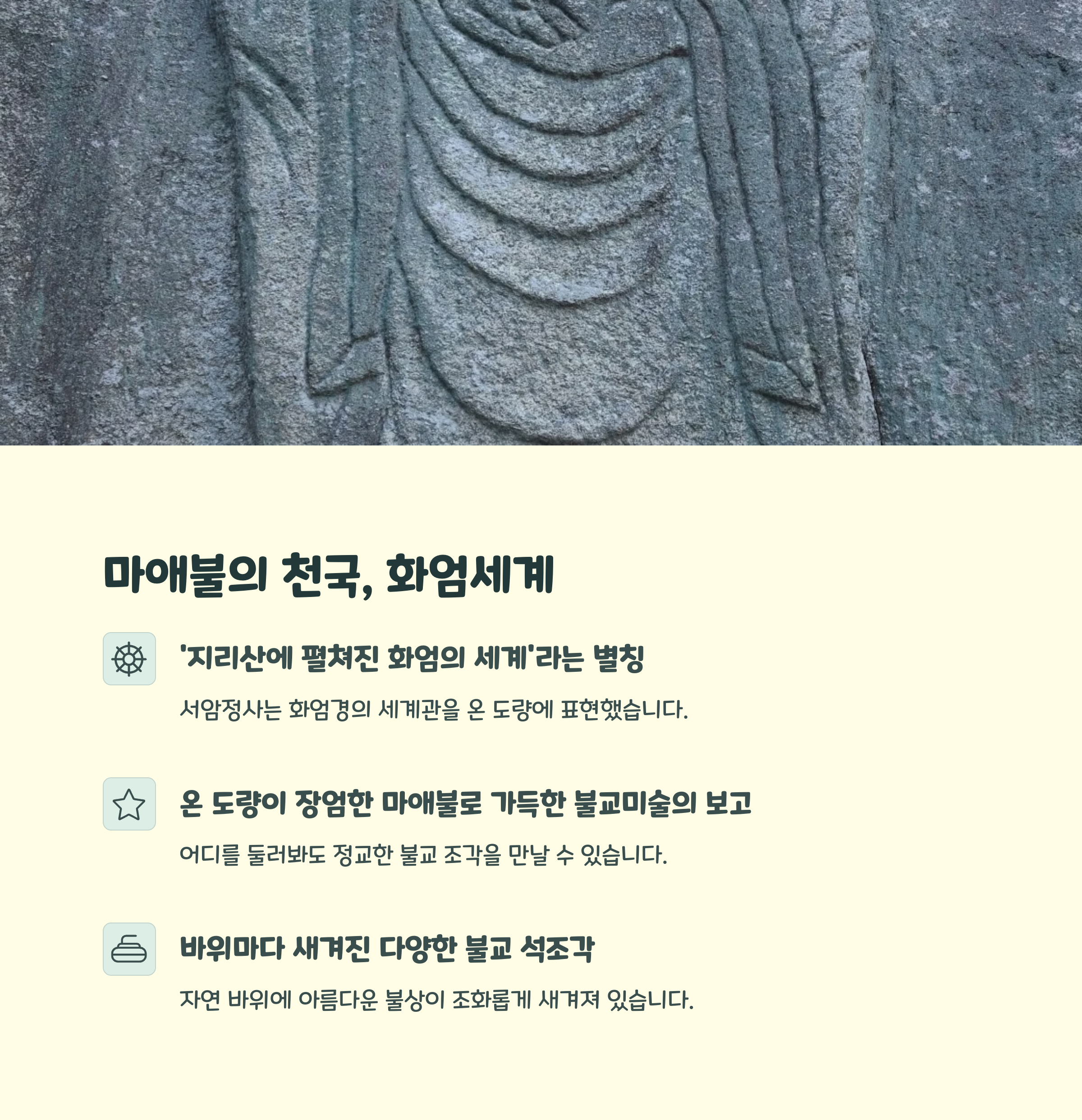 | 천연 암벽에 새겨진 아미타불과 8보살 | 15년간 금박으로 필사한 불교 경전 | 사찰 입구와 이어진 지리산 명소 |