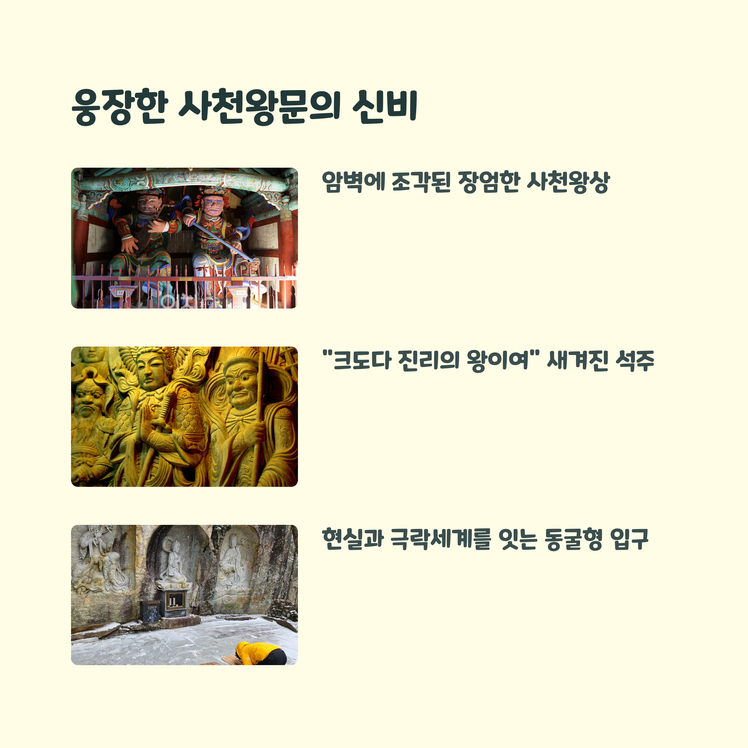 가장 대표적인 공간인 극락전 석굴 법당은 아미타불을 중심으로 8보살, 10대 제자들이 정교하게 새겨진 공간으로, 조명이 들어오면 천상의 세계를 떠올리게 하는 압도적인 분위기를 자아냅니다. 바닥 또한 암반 그대로를 살려 제작되어 자연 그 자체가 법당이 된 듯한 신비로움을 느낄 수 있죠. 내부에 울려 퍼지는 염불 소리와 향냄새는 방문객의 마음을 자연스럽게 가라앉혀주며, 마음속 번잡함을 비워내는 수행 공간으로서의 역할도 충실히 하고 있습니다. 사진으로 보는 것보다 직접 방문해 체험했을 때 더 큰 감동을 느낄 수 있는 대표적인 예입니다.