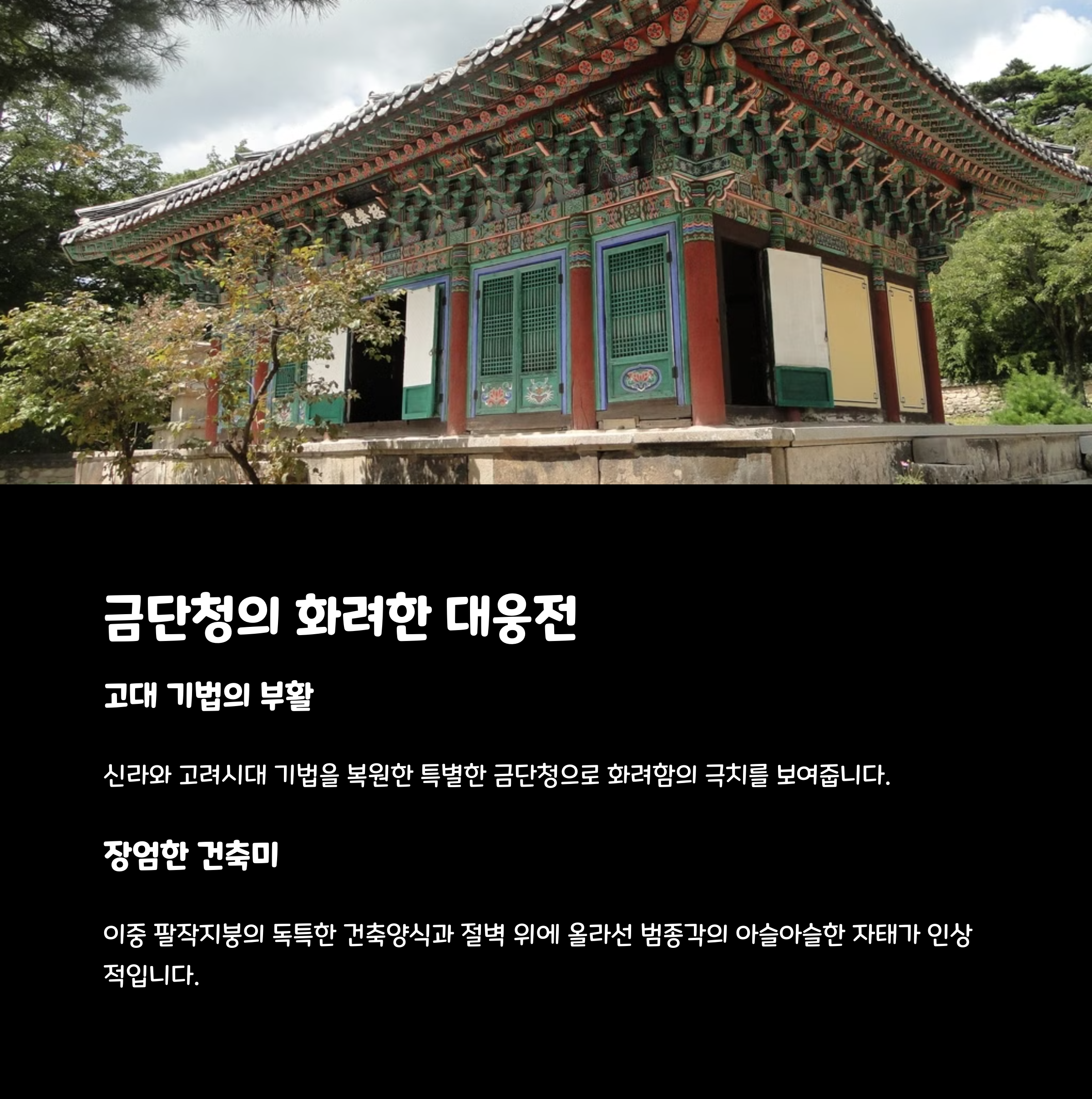 | 법당 내부까지 살아있는 불교 예술 | 불교문화 복원 사례로 문화재적 가치 | 계곡 소리와 숲길이 어우러진 산책지 |