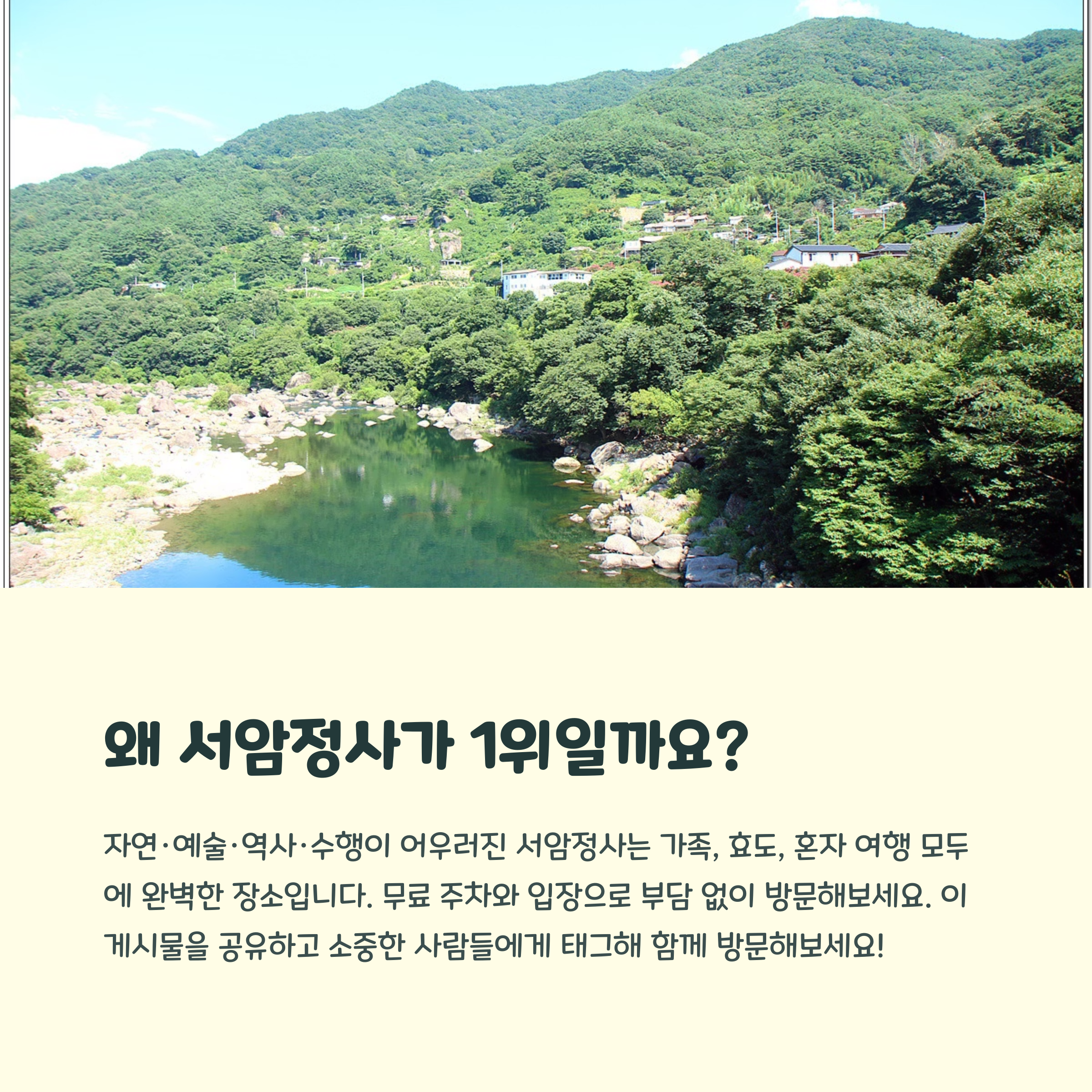 서암정사는 단지 불교 신자가 아니더라도 자연과 예술, 역사에 관심 있는 누구에게나 깊은 감동을 주는 공간입니다. 원응 스님이 15년에 걸쳐 금박으로 사경한 화엄경 전시 공간은 조용히 마음을 내려놓고 경전을 음미할 수 있는 귀중한 장소로 많은 이들이 찾고 있습니다. 접근성도 뛰어나 주차 후 짧은 계단만 오르면 바로 경내에 도착할 수 있으며, 사찰 앞 계곡에서는 여름철 물놀이와 산책도 함께 즐길 수 있어 사계절 언제 방문해도 매력이 가득합니다.