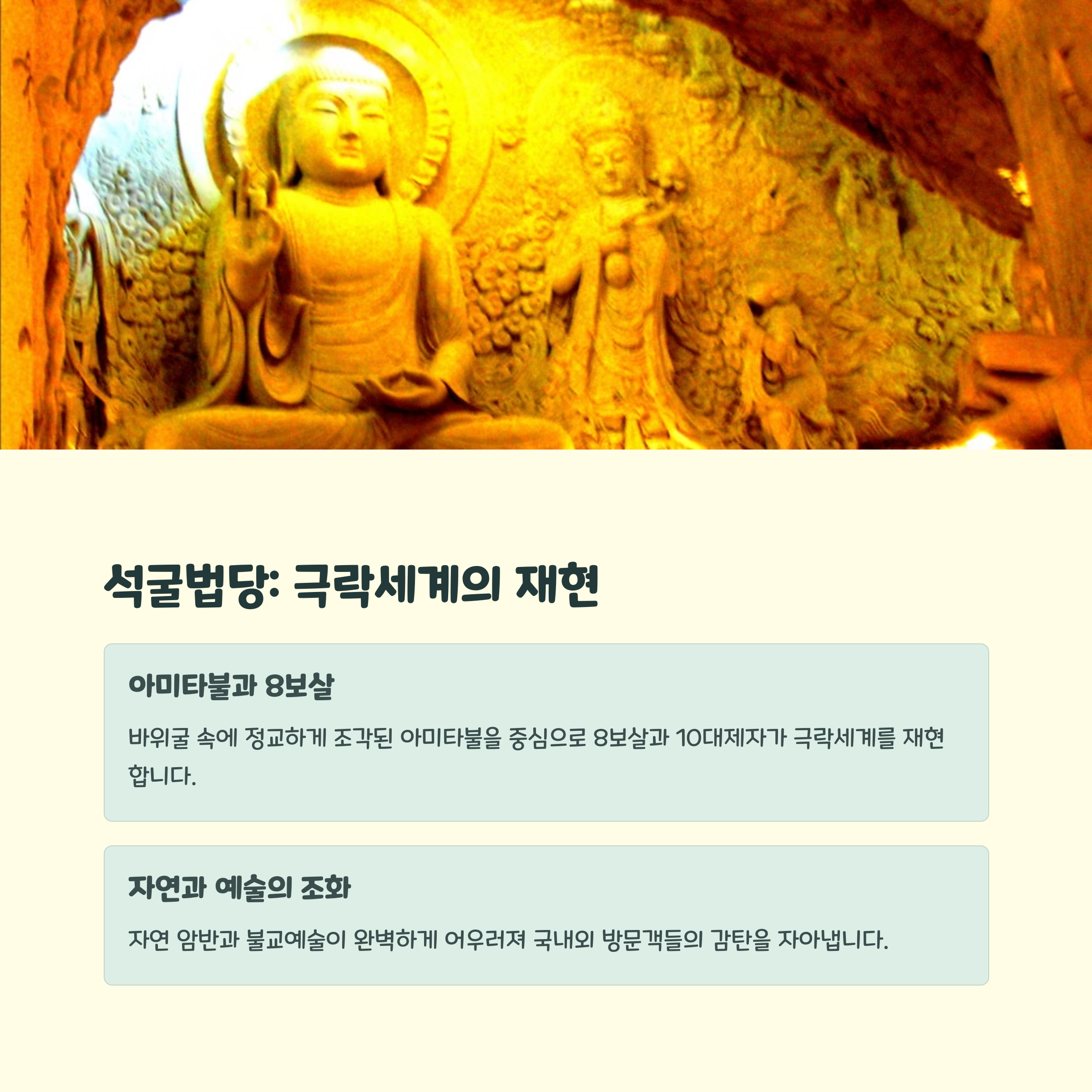 | 석굴 법당 | 천연 암반에 조각된 아미타불과 8보살 형상 |