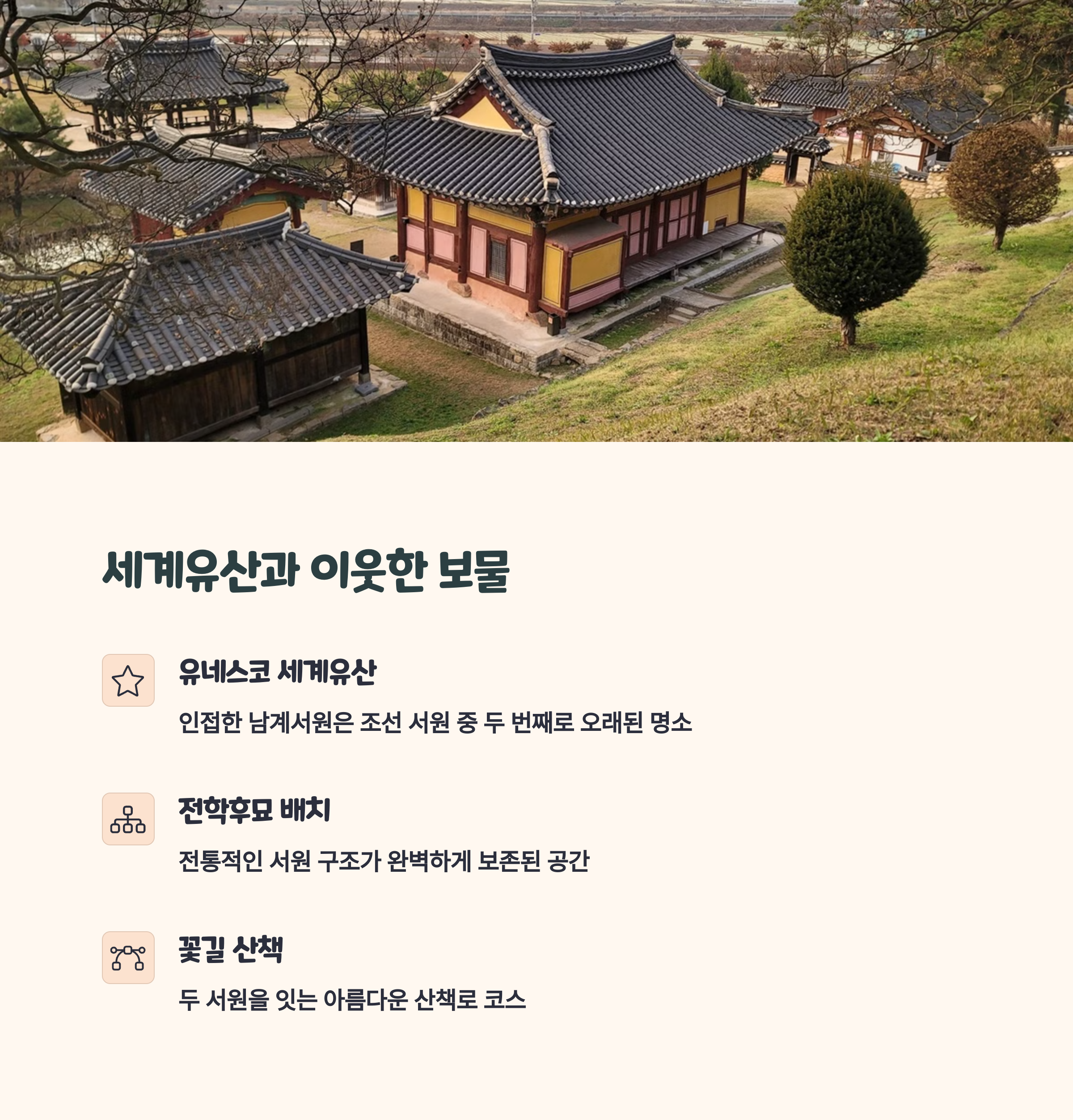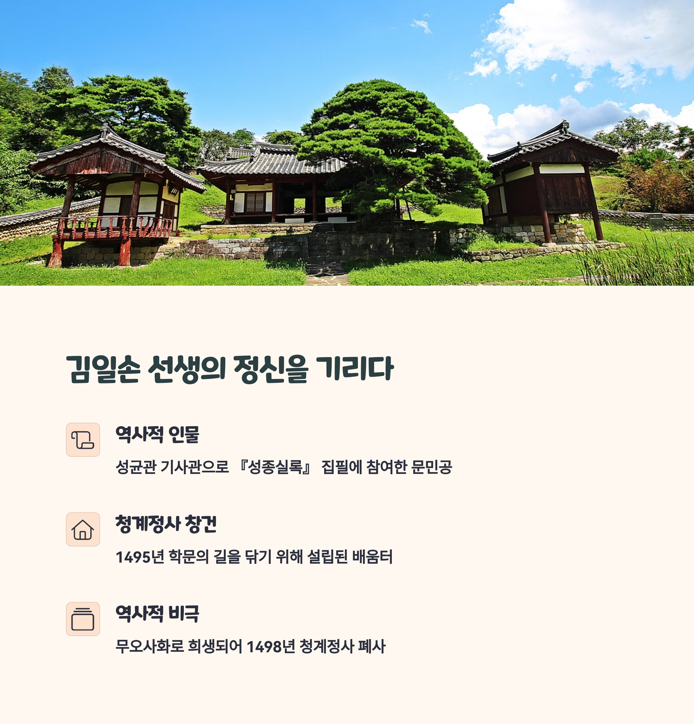 | 김일손 추모 위해 조선시대 세워진 전통 서원 | 고택·연못·장독대 어우러진 조용한 한옥길 | 남계서원·일두고택과 함께 걷는 유산 탐방 |