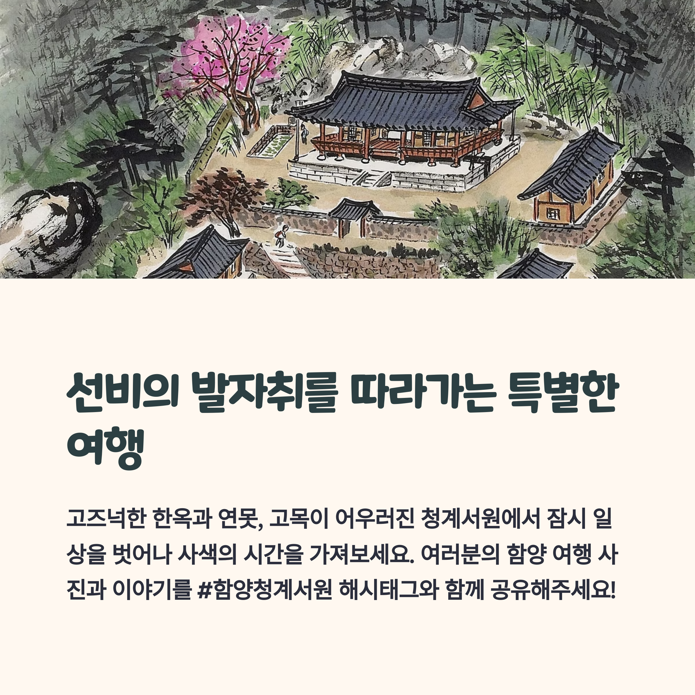 조용한 고택 여행을 좋아하시나요? 청계서원 외에도 추천하고 싶은 문화유산이나 산책길이 있다면 댓글로 알려주세요. 여러분의 이야기가 많은 이들에게 또 다른 힐링 여행지를 선물해줄 수 있습니다.