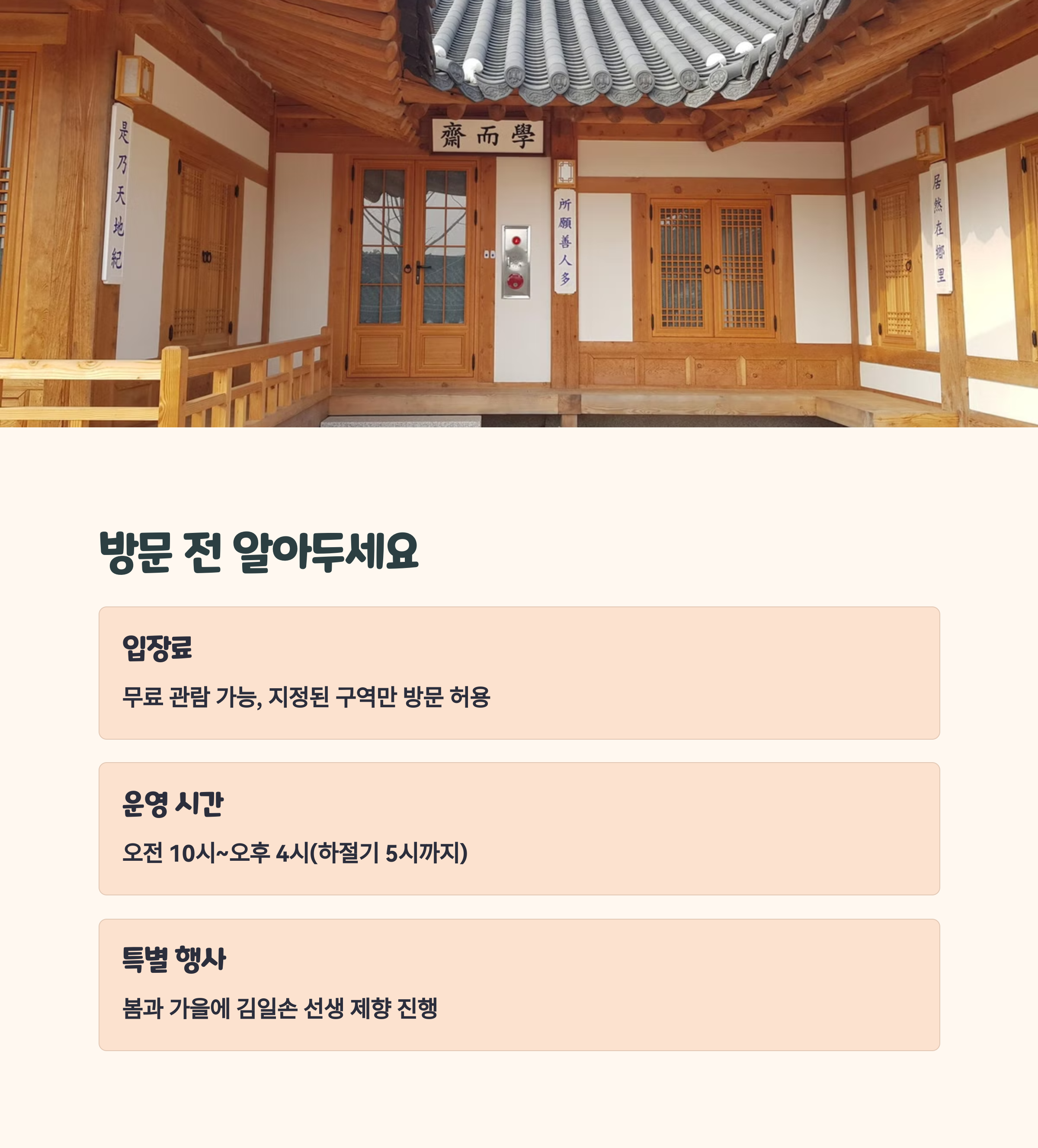 | 무료 개방, 운영시간 엄수 필요 | 번잡하지 않아 사색하며 산책하기 좋은 곳 | 조용한 시골 정취 속 문화적 힐링 경험 |