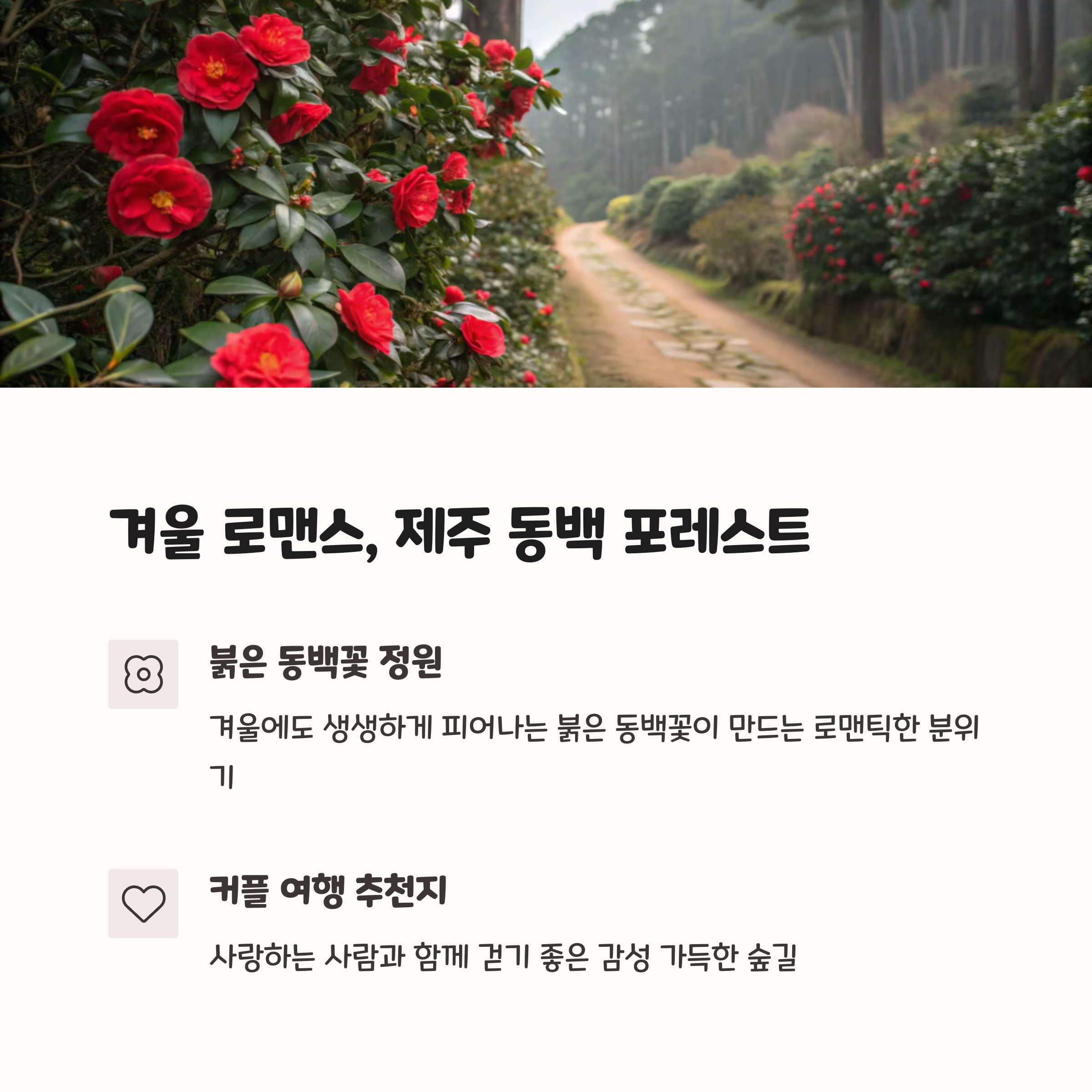 강릉 ‘안반데기’는 새벽 풍경이 압권입니다. 고랭지 채소밭과 구름 바다가 어우러진 이곳은 ‘한국의 스위스’라 불릴 정도로 아름답고, 드론 촬영이나 일출 사진으로도 유명합니다. ‘제주 동백 포레스트’는 겨울에도 붉게 피는 동백꽃이 마치 동화 같은 분위기를 자아냅니다. 감성적인 인생샷을 남기기에 최적이며, 이국적인 느낌까지 더해져 로맨틱한 여행지로 사랑받고 있죠.