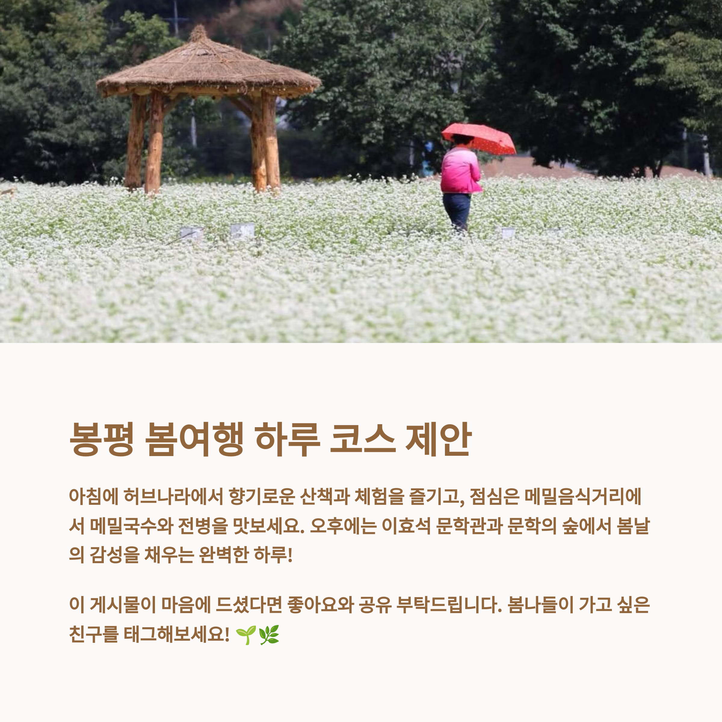 허브나라에서 충분히 여유를 즐긴 뒤에는 인근 메밀음식거리에서 메밀국수, 전병, 묵사발 등 지역 특산 음식을 즐기고, 이효석 문학관과 문학의 숲길로 이동해 산책을 마무리하면 하루 코스가 완벽하게 구성됩니다. 자연, 문학, 향기가 모두 어우러지는 코스로 봄나들이에 강력 추천됩니다.