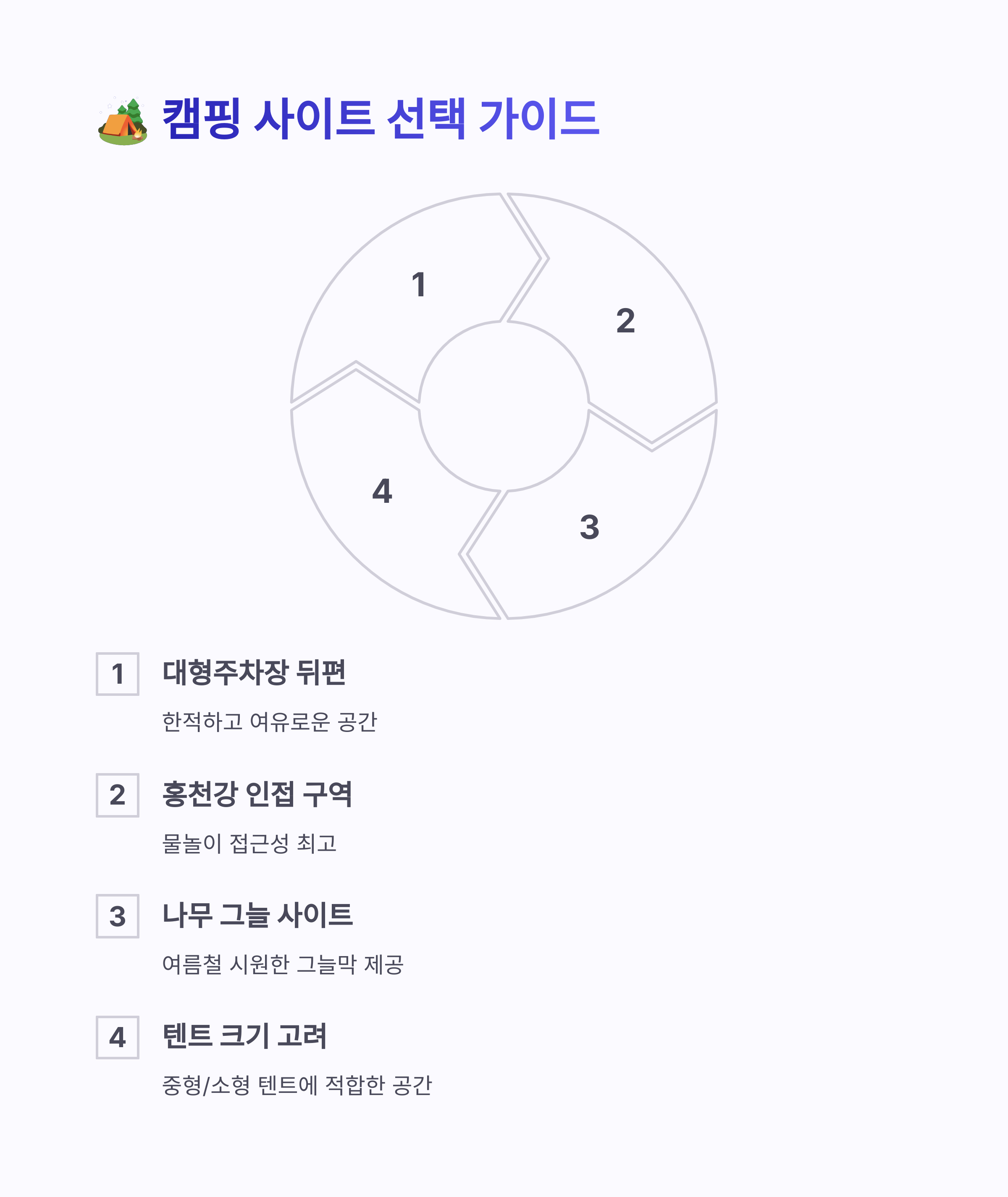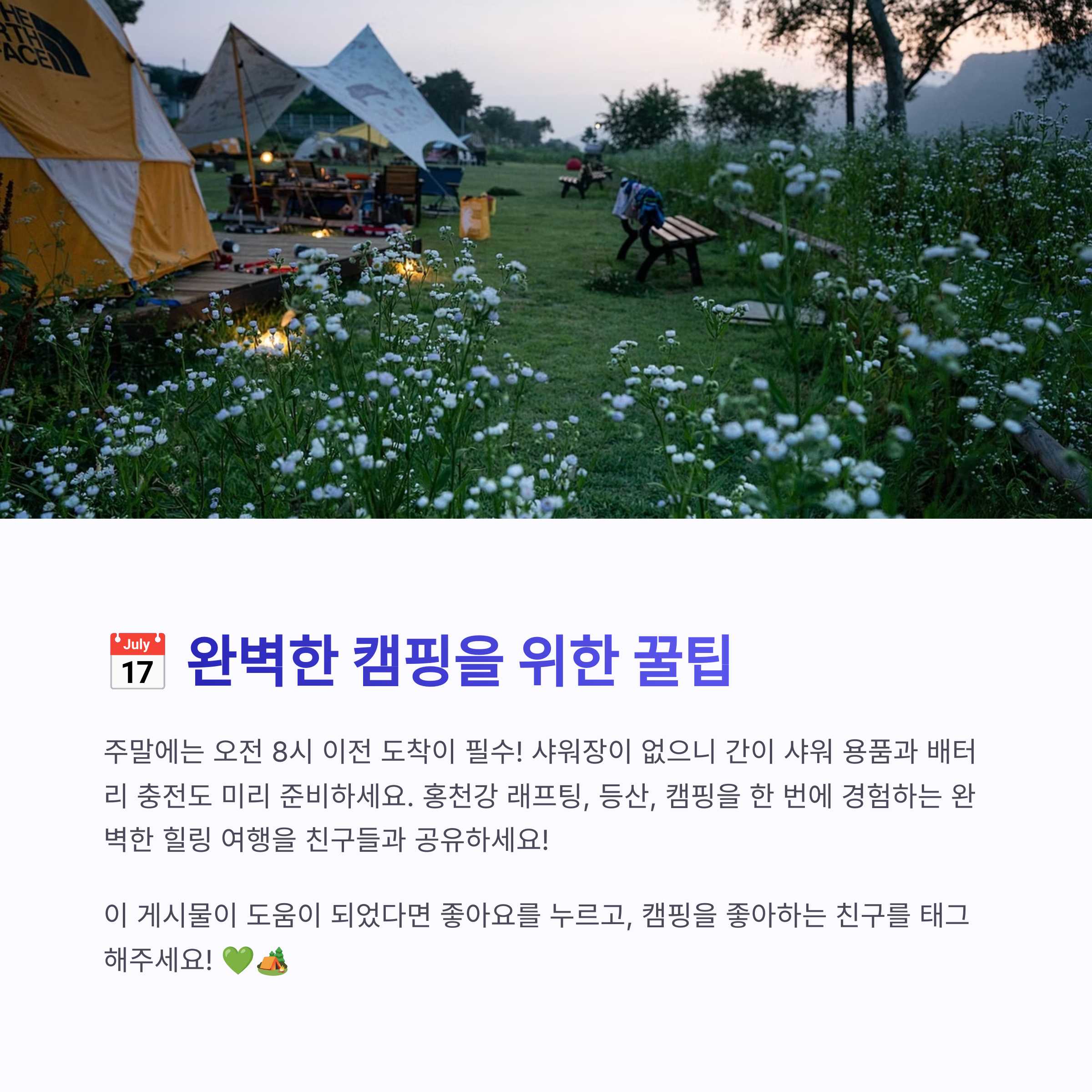 | 부대시설·마트 인접 | 현장 선착순 자리 | 홍천강 래프팅 코스 |