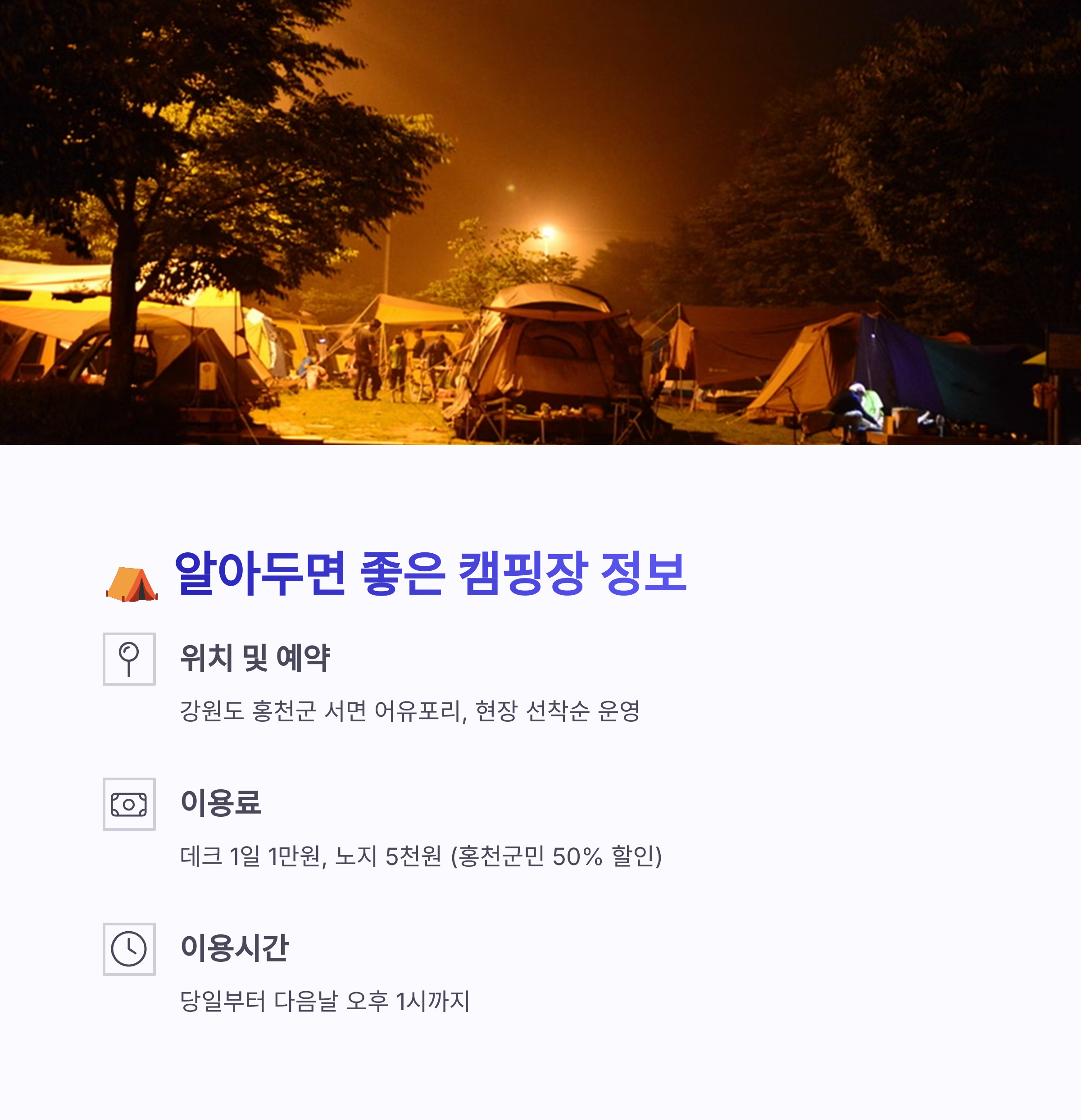 이용 팁 현장 선착순 이용, 1일 1만 원(군민 5천 원), 나무 그늘·강변 인기