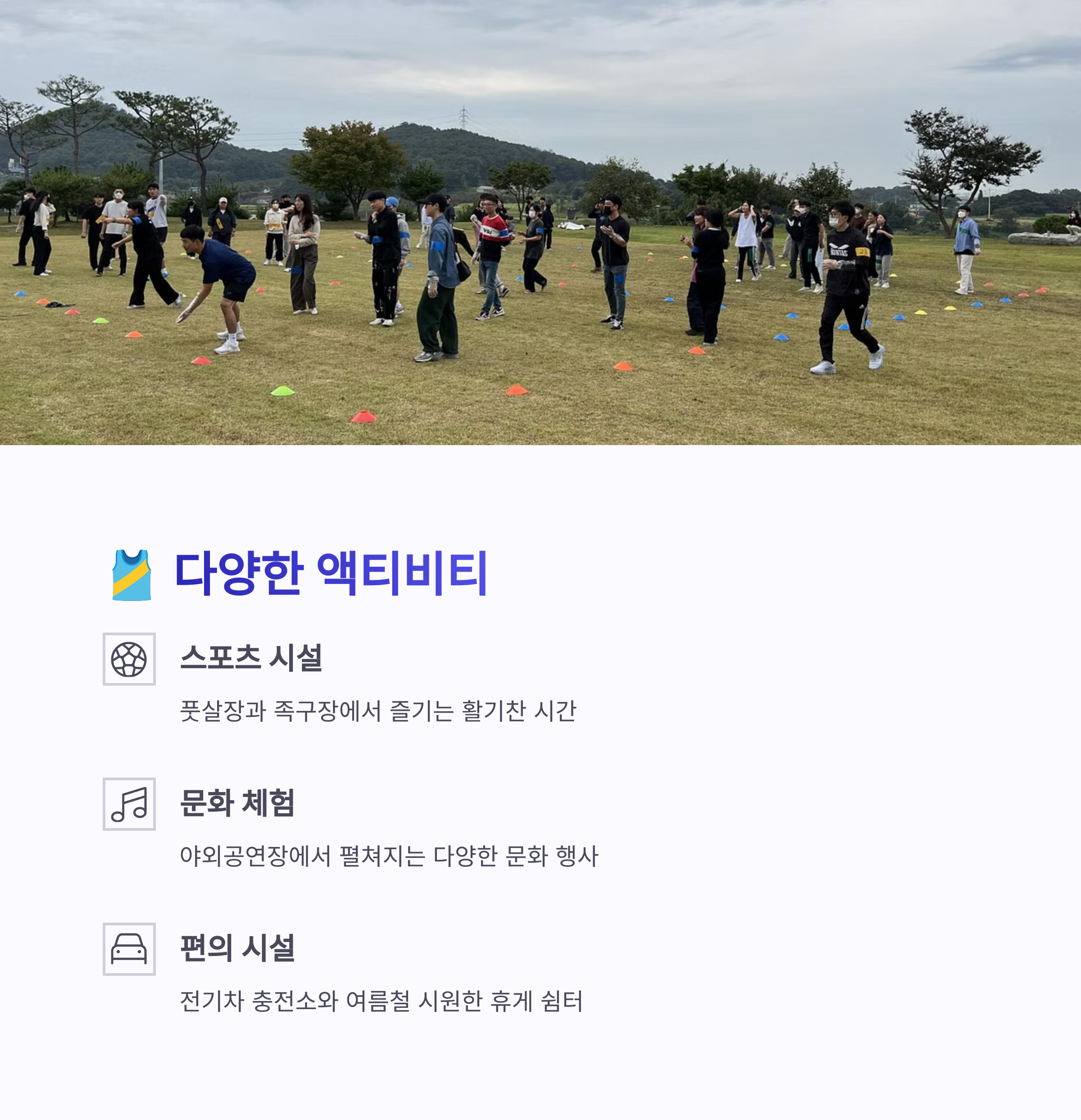 주변에는 풋살장, 족구장, 야외공연장 같은 부대시설과 식당, 마트도 도보권에 위치해 있어 장보기나 식사도 어렵지 않습니다. 캠핑뿐 아니라 홍천강 래프팅, 팔봉산 등산까지 하루 코스로 묶어 즐길 수 있어 가성비와 가심비를 모두 만족시켜주는 캠핑지입니다. 자연 속 조용한 힐링을 원한다면 팔봉산 유원지는 더없이 좋은 선택이 될 것입니다.