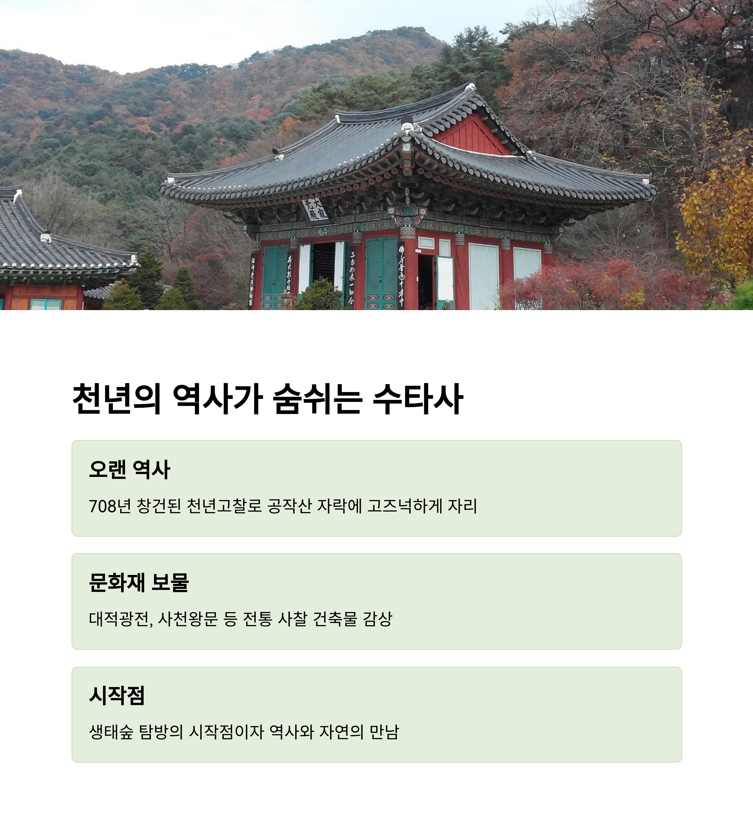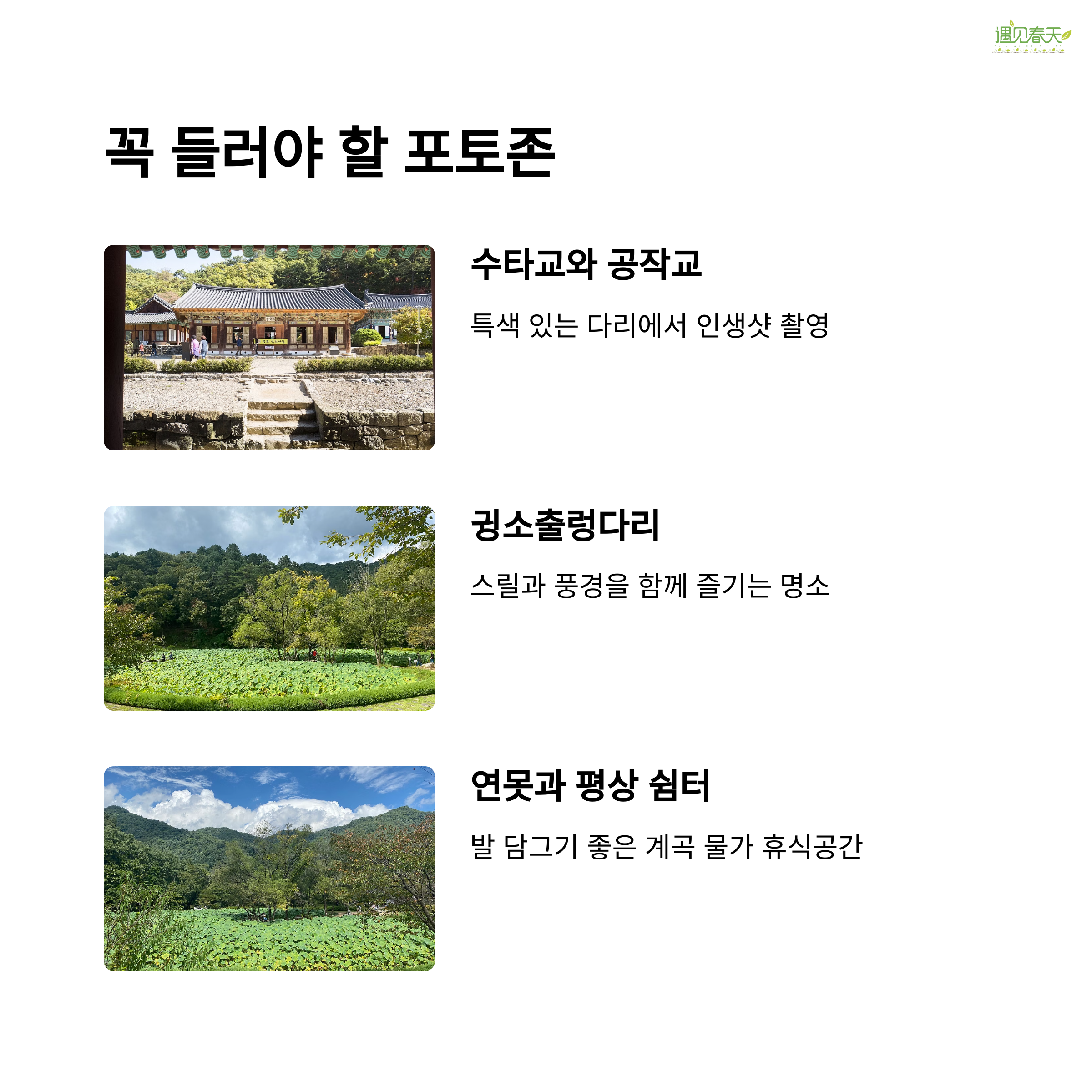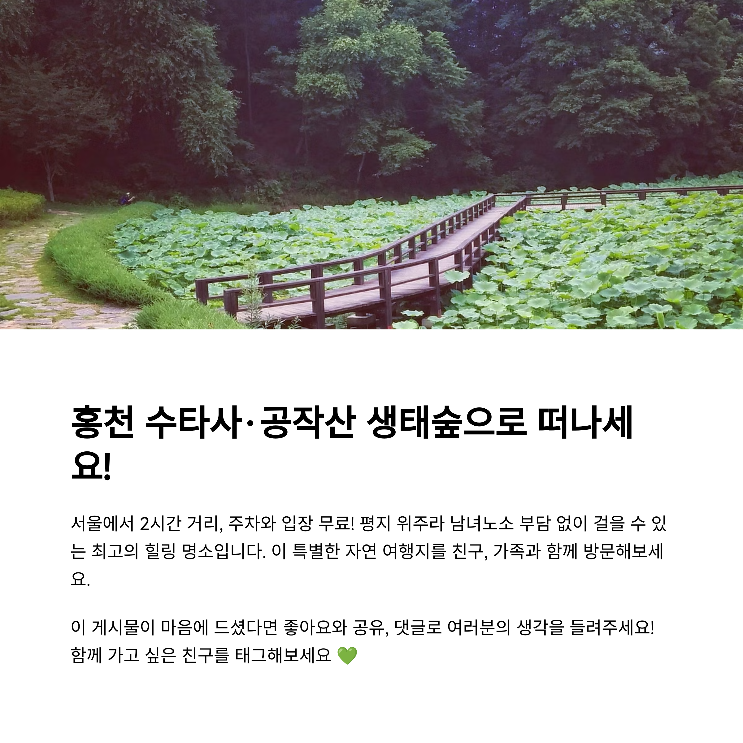 자연과 역사의 조화를 느낄 수 있는 홍천 수타사와 공작산 생태숲은 단순한 관광지를 넘어 삶의 여유와 치유를 전해주는 소중한 공간입니다. 바쁜 일상에서 벗어나 사색과 힐링이 필요할 때, 이곳에서의 걷기 여행은 최고의 선택이 될 것입니다. 사계절 내내 다른 얼굴로 우리를 맞아주는 숲길과 사찰의 풍경은 방문할 때마다 새로운 감동을 안겨줍니다. 오늘 하루, 자연 속으로 한 걸음 내딛어 보세요.