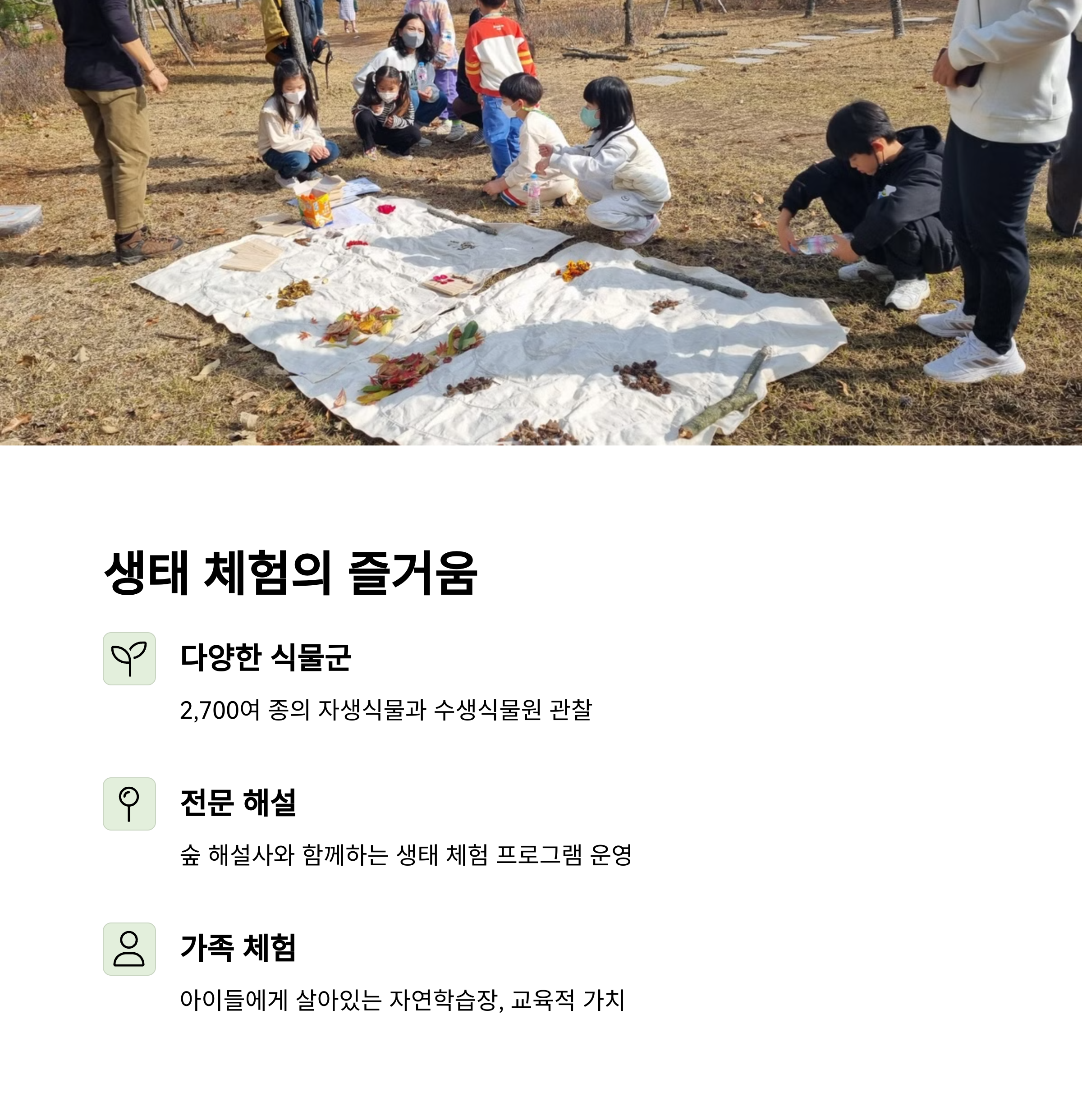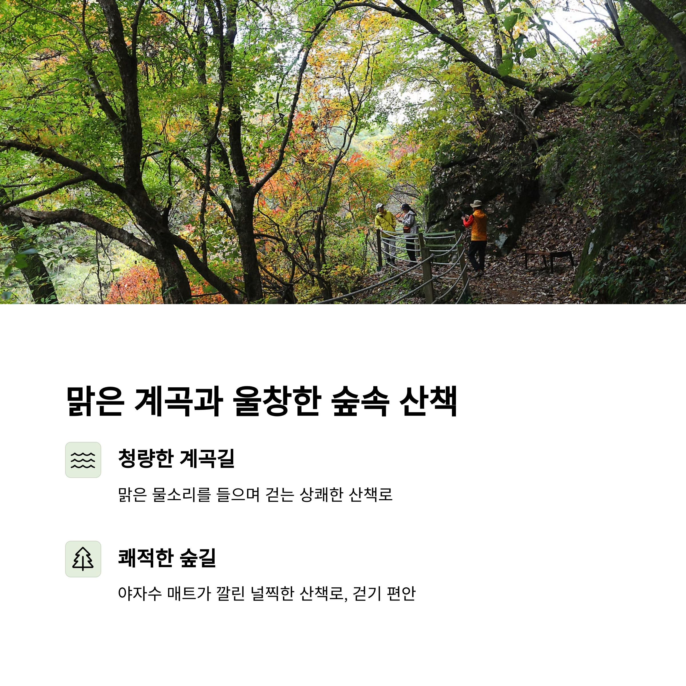 | 천년고찰로 고즈넉한 분위기의 명상 여행지 | 다양한 식물과 생태 체험이 가능한 자연 공간 | 남녀노소 누구나 즐길 수 있는 순환 산책길 |