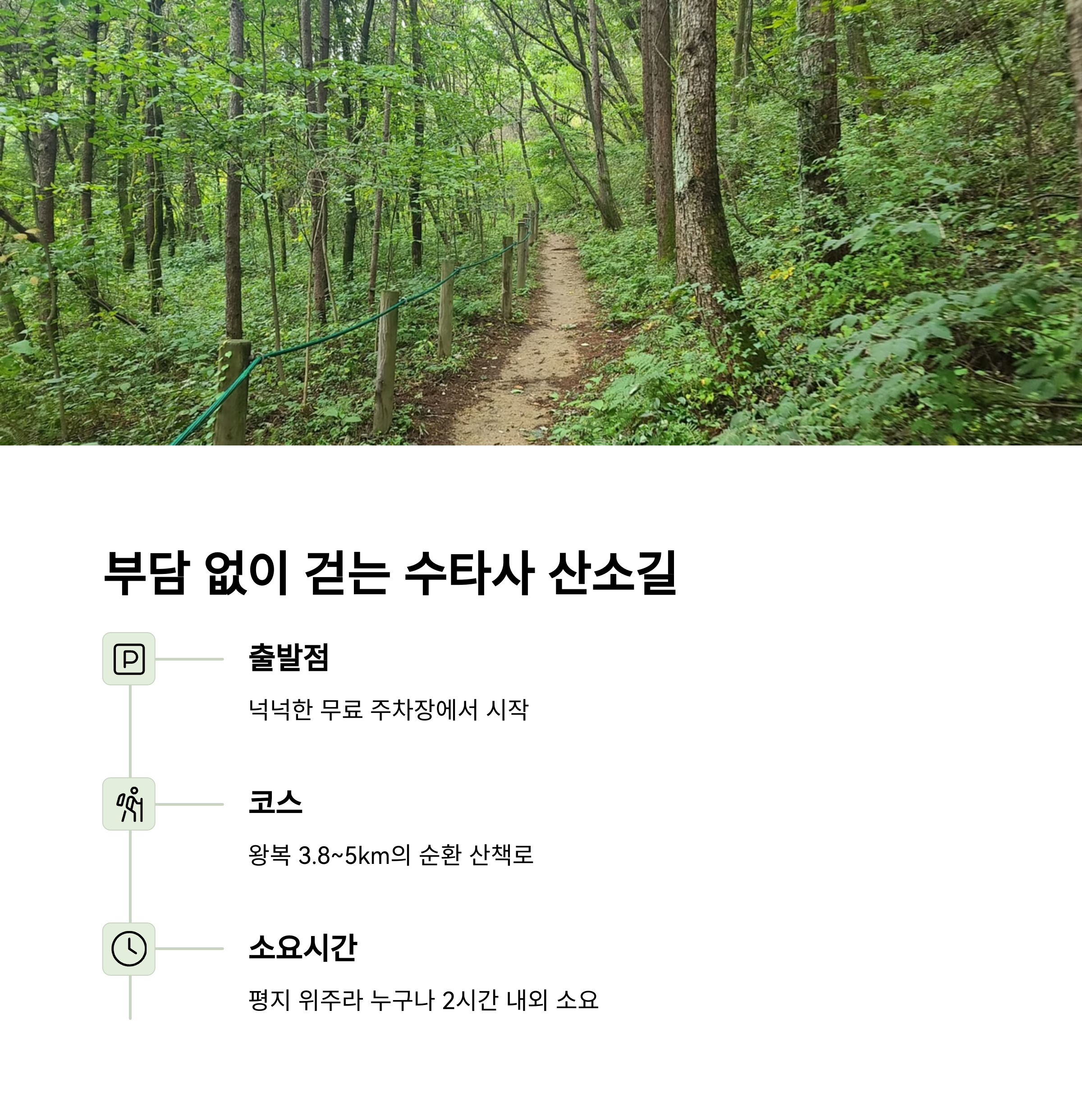 | 수타사 산소길 | 왕복 약 3.8~5km 평지로 남녀노소 걷기 좋은 코스 |