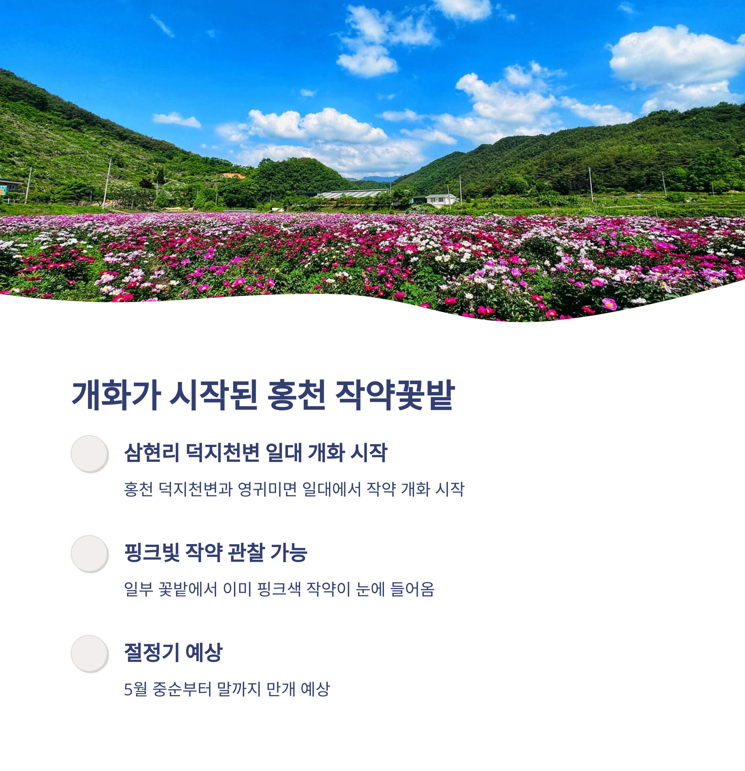 5월이 되면 강원도 홍천은 분홍빛 작약으로 물들기 시작합니다. 특히 삼현리 덕지천변과 영귀미면 일대는 매년 작약이 피어나는 대표적인 개화 명소로, 인생 사진을 남기려는 이들로 북적이곤 합니다. 2025년 5월 초 현재, 일부 꽃밭에서는 이미 작약의 꽃잎이 열리기 시작했으며, 5월 중순부터 본격적인 만개가 예상되고 있습니다. 이 시기 홍천을 찾으면 넓게 펼쳐진 핑크빛 작약 풍경을 한눈에 담을 수 있어 도심을 벗어난 힐링 여행지로 제격입니다.