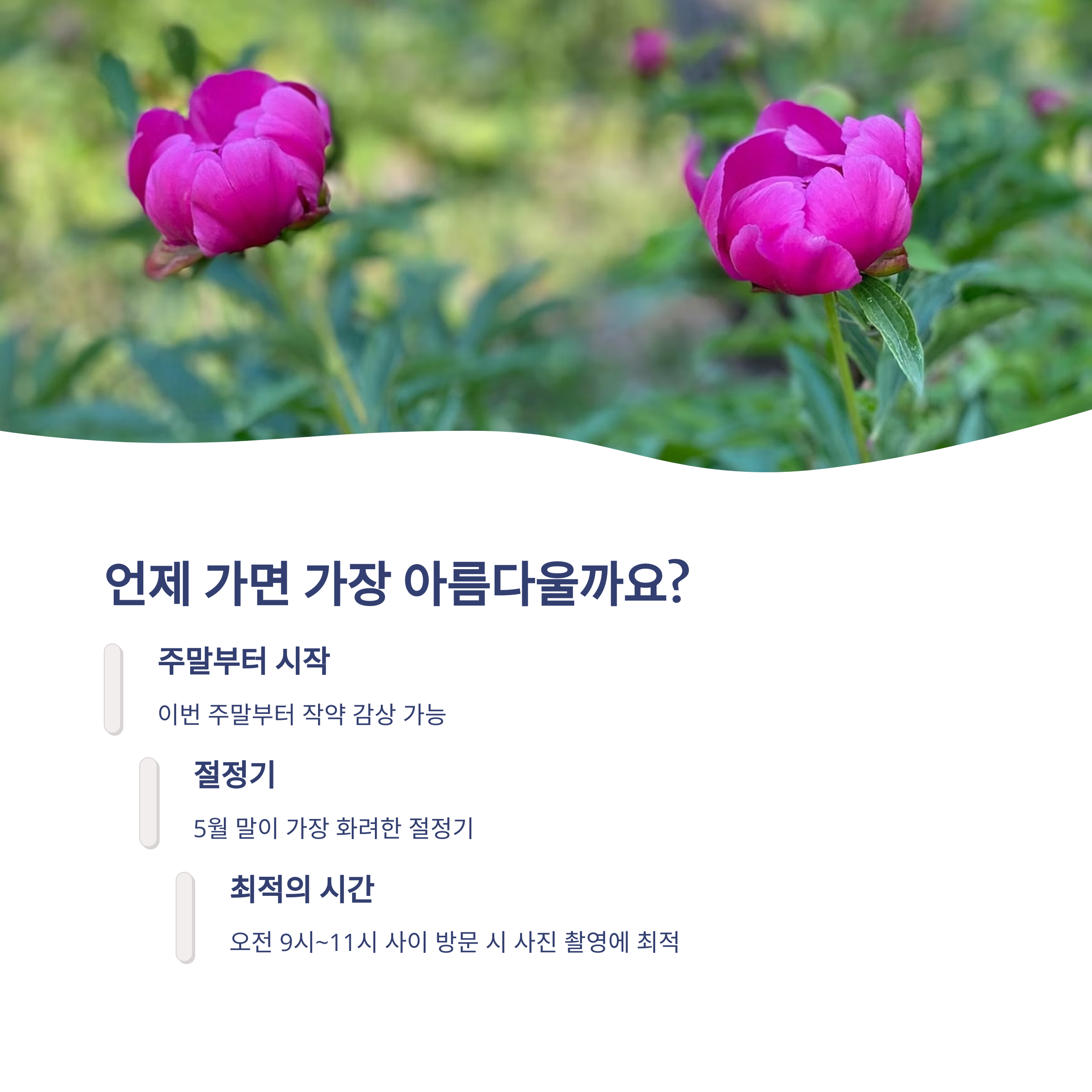 작약은 하루가 다르게 개화 속도가 빨라지기 때문에 방문 시기를 잘 맞추는 것이 중요합니다. 5월 중순부터 말까지는 작약이 절정에 달하며, 햇살 좋은 날에는 더욱 선명한 색감과 풍성한 꽃잎이 감동을 더해줍니다. 특히 수타사 방향으로 가는 길목은 접근성이 좋고, 주변 풍경도 잘 어우러져 산책 코스로도 인기가 높습니다. 최근 현장 방문 후기에 따르면 이미 핑크빛이 물들기 시작해 이번 주말부터 본격적인 꽃놀이가 가능할 전망입니다.