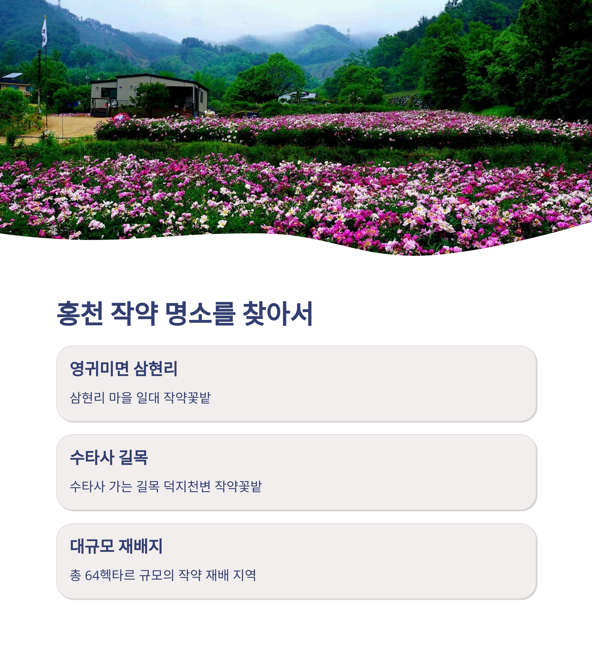 5월이 되면 강원도 홍천은 분홍빛 작약으로 물들기 시작합니다. 특히 삼현리 덕지천변과 영귀미면 일대는 매년 작약이 피어나는 대표적인 개화 명소로, 인생 사진을 남기려는 이들로 북적이곤 합니다. 2025년 5월 초 현재, 일부 꽃밭에서는 이미 작약의 꽃잎이 열리기 시작했으며, 5월 중순부터 본격적인 만개가 예상되고 있습니다. 이 시기 홍천을 찾으면 넓게 펼쳐진 핑크빛 작약 풍경을 한눈에 담을 수 있어 도심을 벗어난 힐링 여행지로 제격입니다.