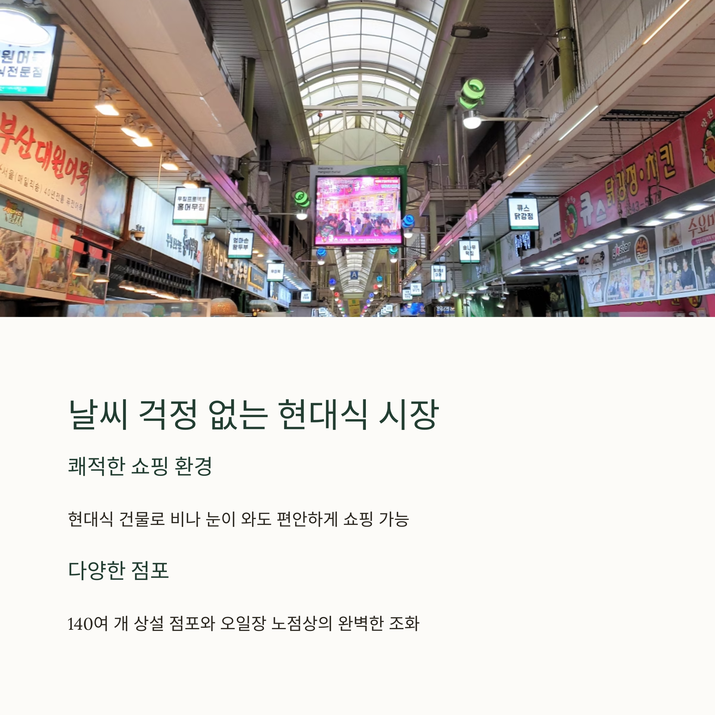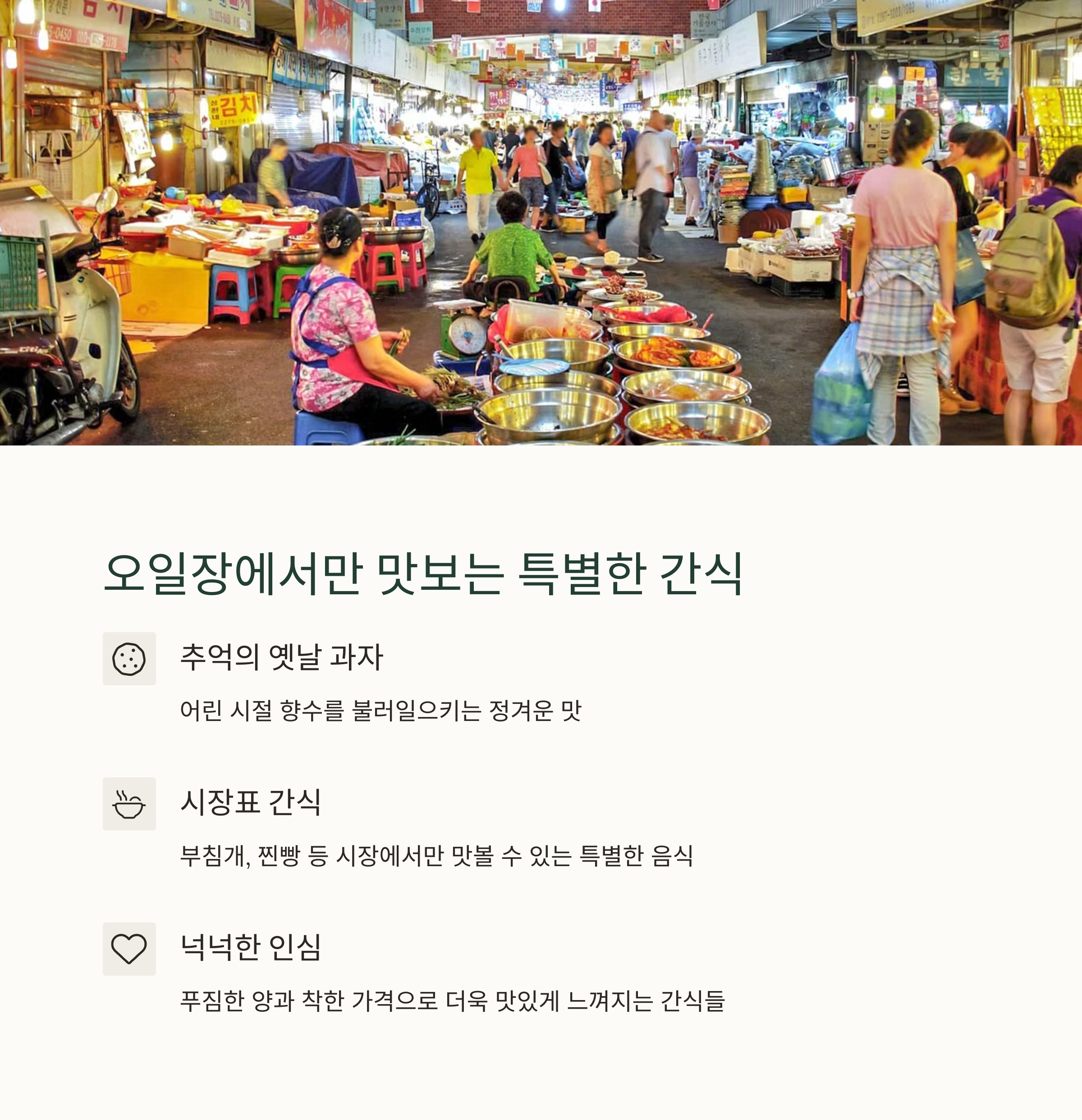 | 다양한 간식과 착한 가격의 명소 | 구입은 물론 식사도 가능한 장터 | 영양 가득한 보양식으로 인기 |