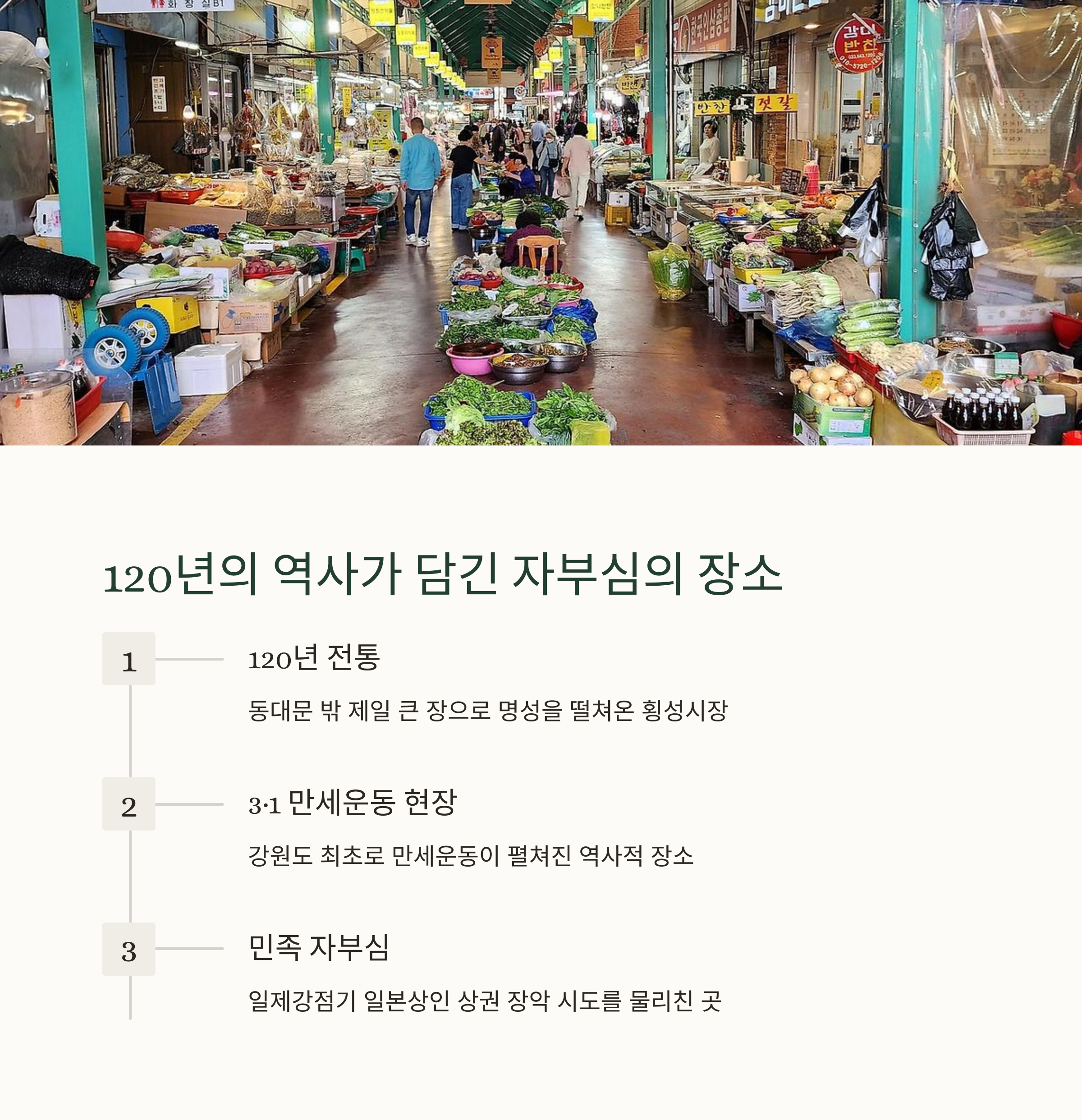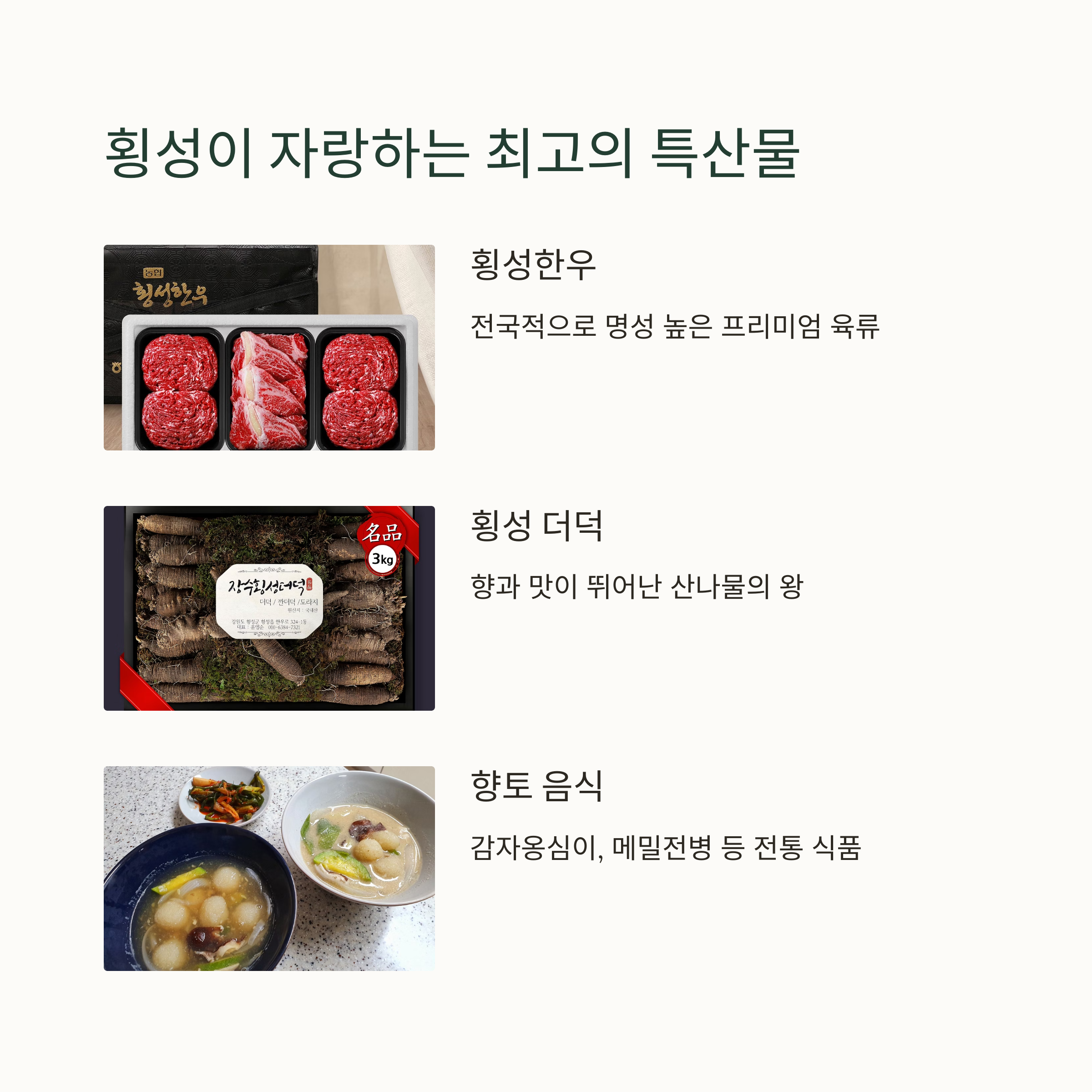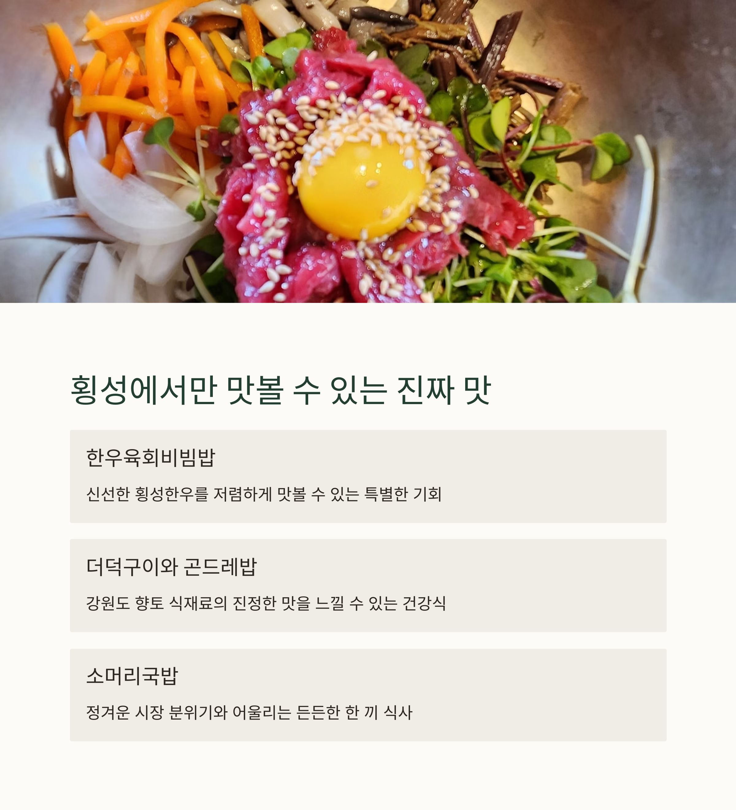 | 매월 1일, 6일 열리는 정기 시장 | 한우, 더덕, 메밀전병 등 지역 농산물 | 깊은 국물 맛의 대표 전통 음식 |