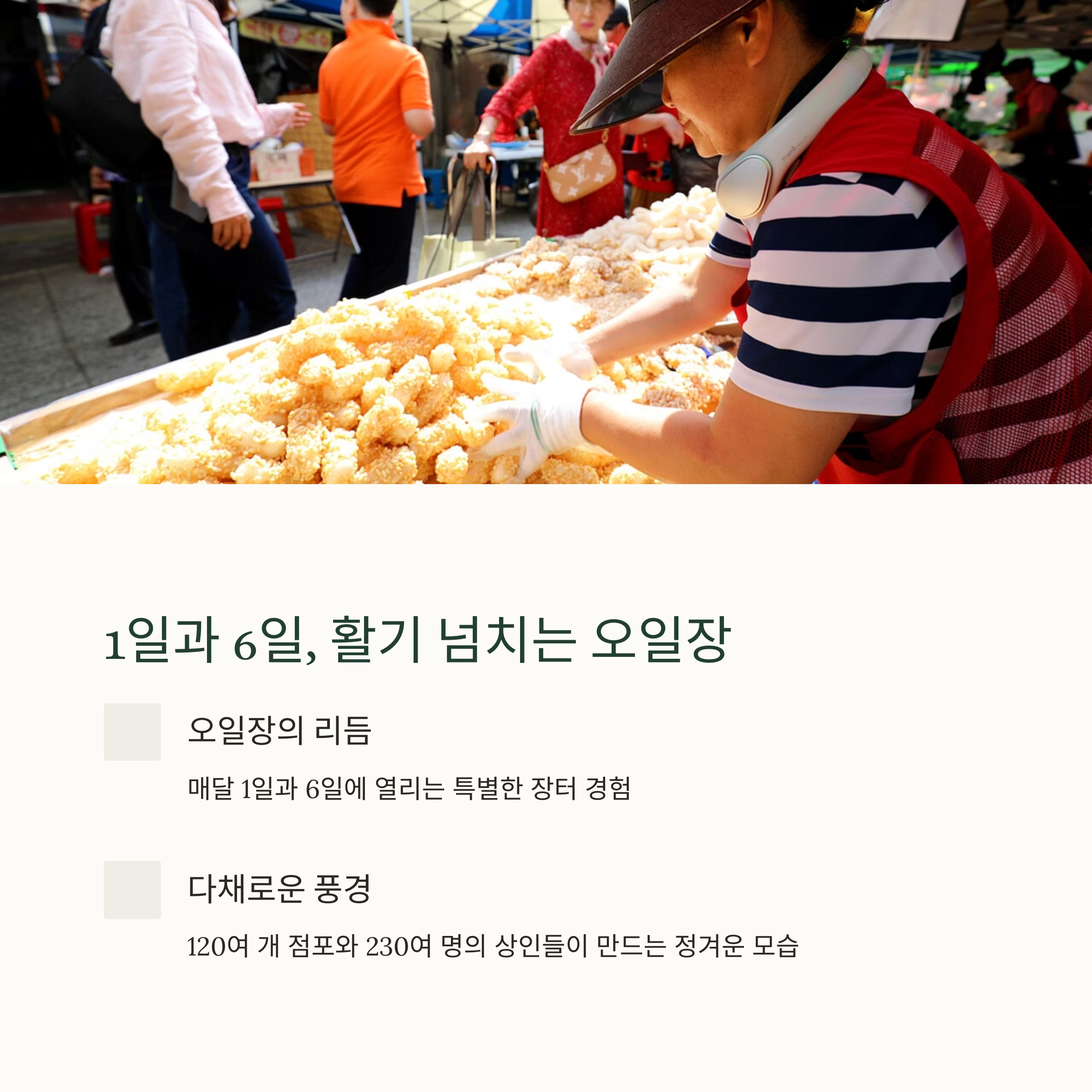 | 오일장 일정 | 매월 1일과 6일 열리는 전통 오일장 |