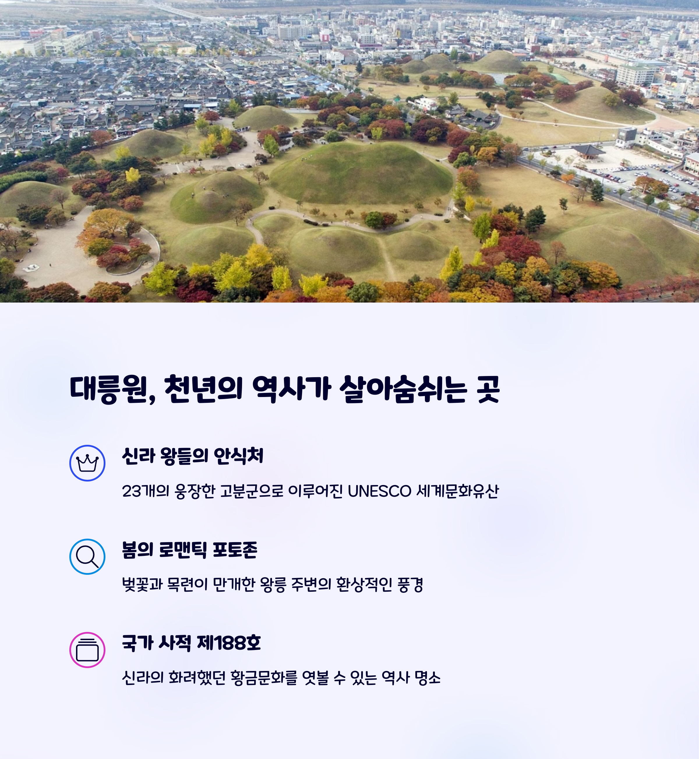 | 고분군과 벚꽃이 어우러진 유적지 | 감성적인 카페와 소품샵 가득한 거리 | 산책, 자전거, 사진 촬영 최적의 장소 |