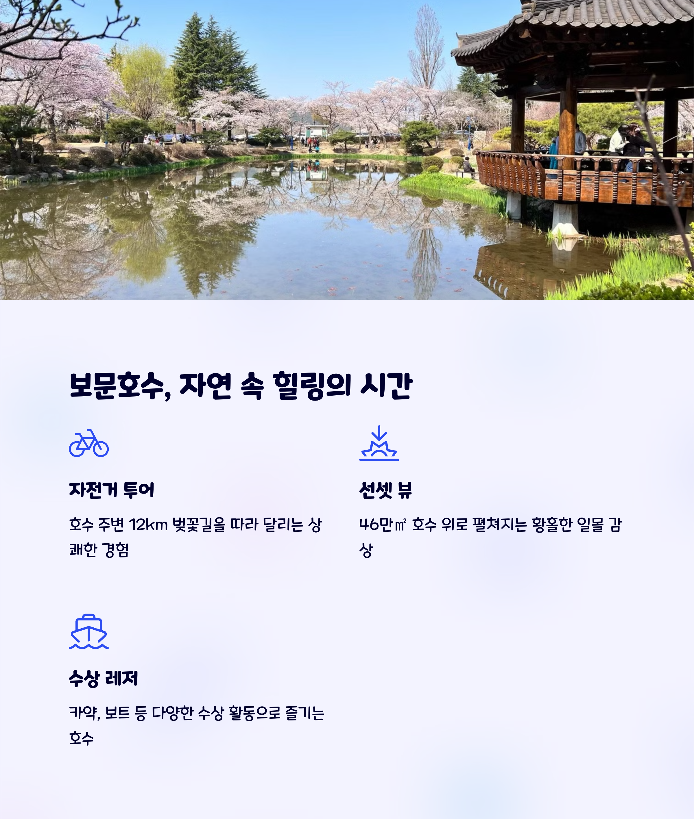 보문호수는 경주의 대표적인 자연 관광지 중 하나로, 호수 주변을 따라 산책하며 벚꽃길을 감상할 수 있습니다. 해질 무렵 물빛과 벚꽃이 어우러져 더욱 환상적인 사진을 찍을 수 있는 장소입니다. 자전거를 타거나 보트를 타는 등 다양한 체험도 가능해 가족 단위 여행자들에게도 큰 인기를 끌고 있습니다.