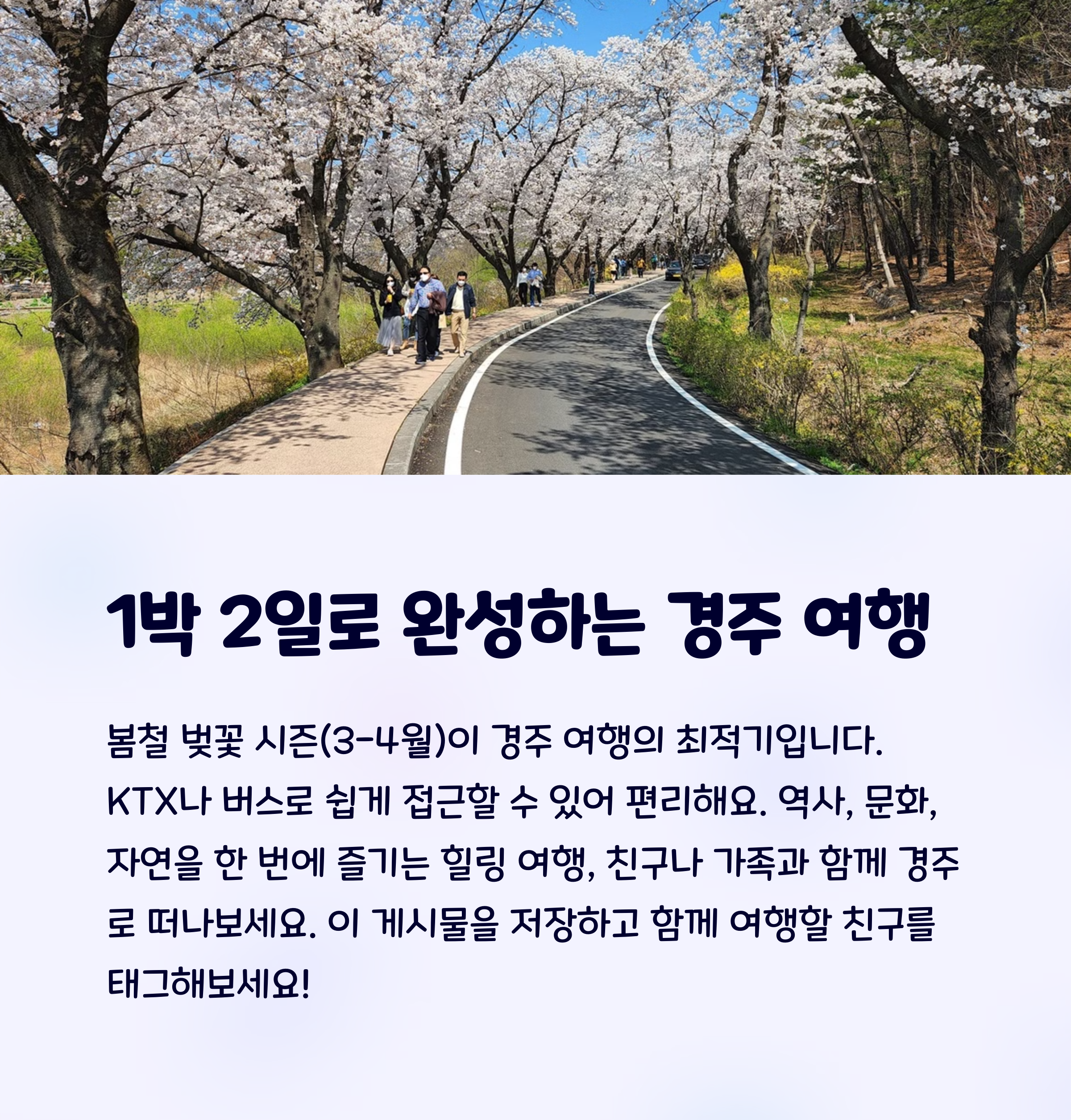 따뜻한 봄바람이 불어오는 계절, 어디론가 훌쩍 떠나고 싶은 마음이 드는 시기입니다. 그중에서도 벚꽃 시즌을 맞아 국내 1박 2일 여행지로 많은 사람들이 찾는 곳이 바로 경주입니다. 역사적인 문화유산과 자연경관이 조화를 이루는 이곳은 누구나 만족할 만한 여행코스를 제공합니다. 특히 사진 찍기 좋은 포토존이 많아 추억을 남기기에도 더없이 좋은 장소인데요. 대릉원의 고즈넉한 풍경, 황리단길의 감성 가득한 거리, 그리고 보문호수의 평화로운 물가까지, 경주는 봄의 정취를 고스란히 담고 있는 도시입니다. 오늘은 경주로 1박 2일 여행을 계획하시는 분들을 위해 꼭 들러야 할 포토존과 함께 여행 팁도 함께 정리해드리겠습니다. 감성 가득한 여행을 원하시는 분들, 이 포스팅을 끝까지 확인해보세요.