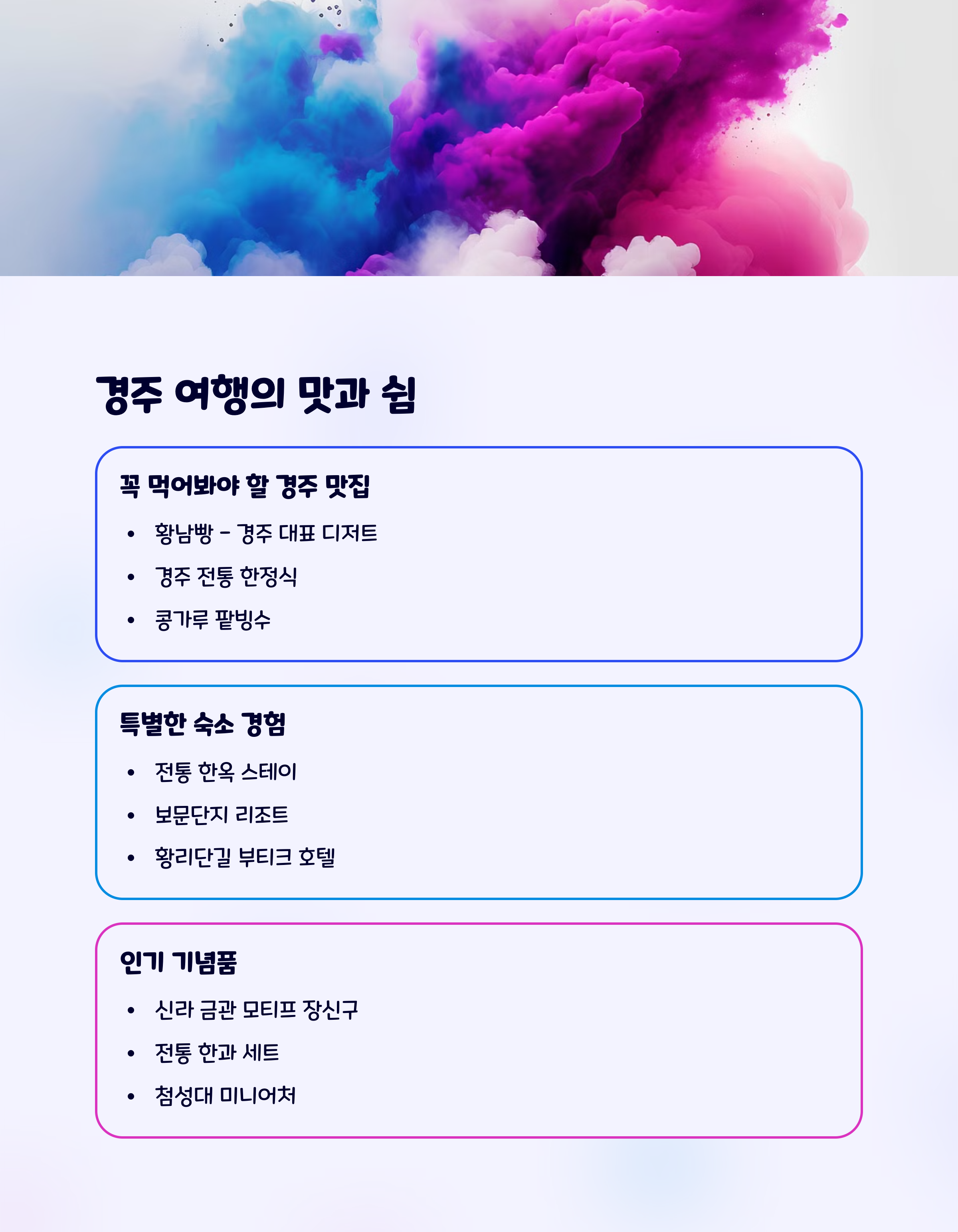벚꽃이 흐드러지게 피는 계절, 역사와 자연이 살아 숨 쉬는 도시 경주는 누구에게나 특별한 시간을 선사하는 여행지입니다. 대릉원의 조용한 분위기, 황리단길의 감성적인 거리, 그리고 보문호수의 평화로운 풍경까지, 짧은 일정 속에서도 풍성한 추억을 남길 수 있습니다. 이번 여행이 단순한 관광을 넘어 마음의 여유를 찾는 시간이 되길 바라며, 포스팅 속 정보들이 여러분의 여행 준비에 실질적인 도움이 되었길 바랍니다.