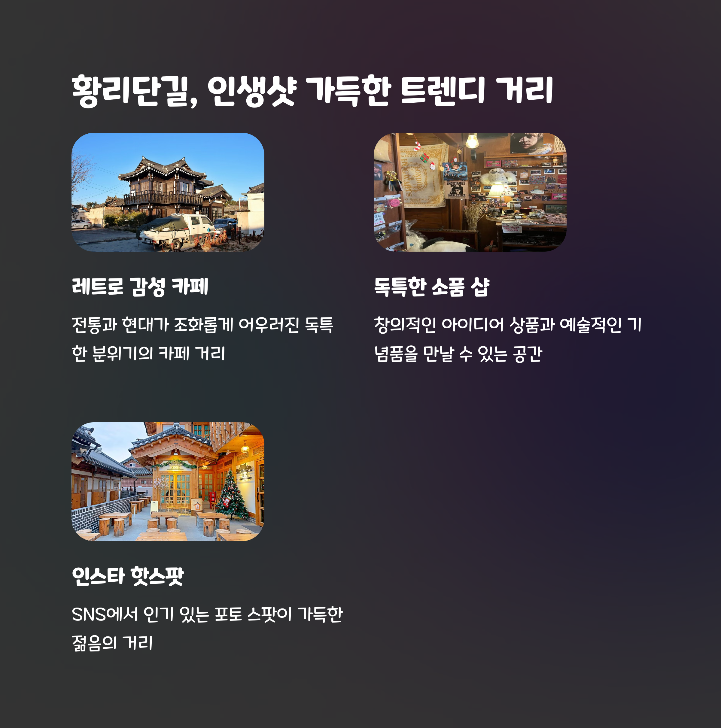 황리단길은 감성적인 카페와 예쁜 소품샵이 줄지어 있어, 걷기만 해도 즐거운 곳입니다. 전통 한옥과 현대적인 감각이 공존하는 풍경이 인상적이며, 사진을 찍기 좋은 스팟이 많아 SNS에서도 자주 볼 수 있는 장소입니다. 특히 봄에는 곳곳에 꽃이 피어 거리의 분위기를 한층 따뜻하게 만들어 줍니다. 친구, 연인, 가족 누구와 함께해도 좋은 추억을 남길 수 있는 장소입니다.
