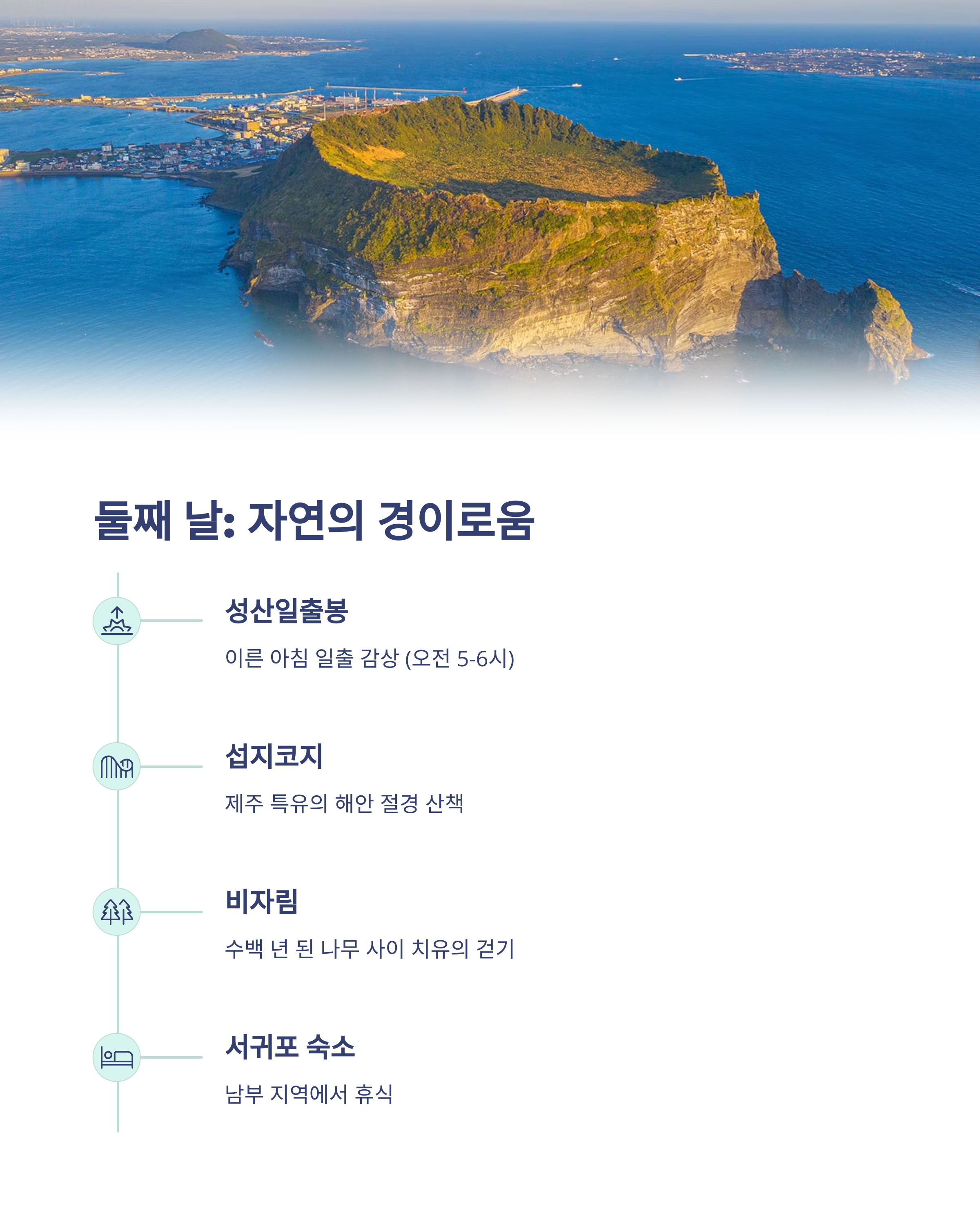 | 여행 핵심 장소 | 함덕, 성산일출봉, 비자림, 중문 |